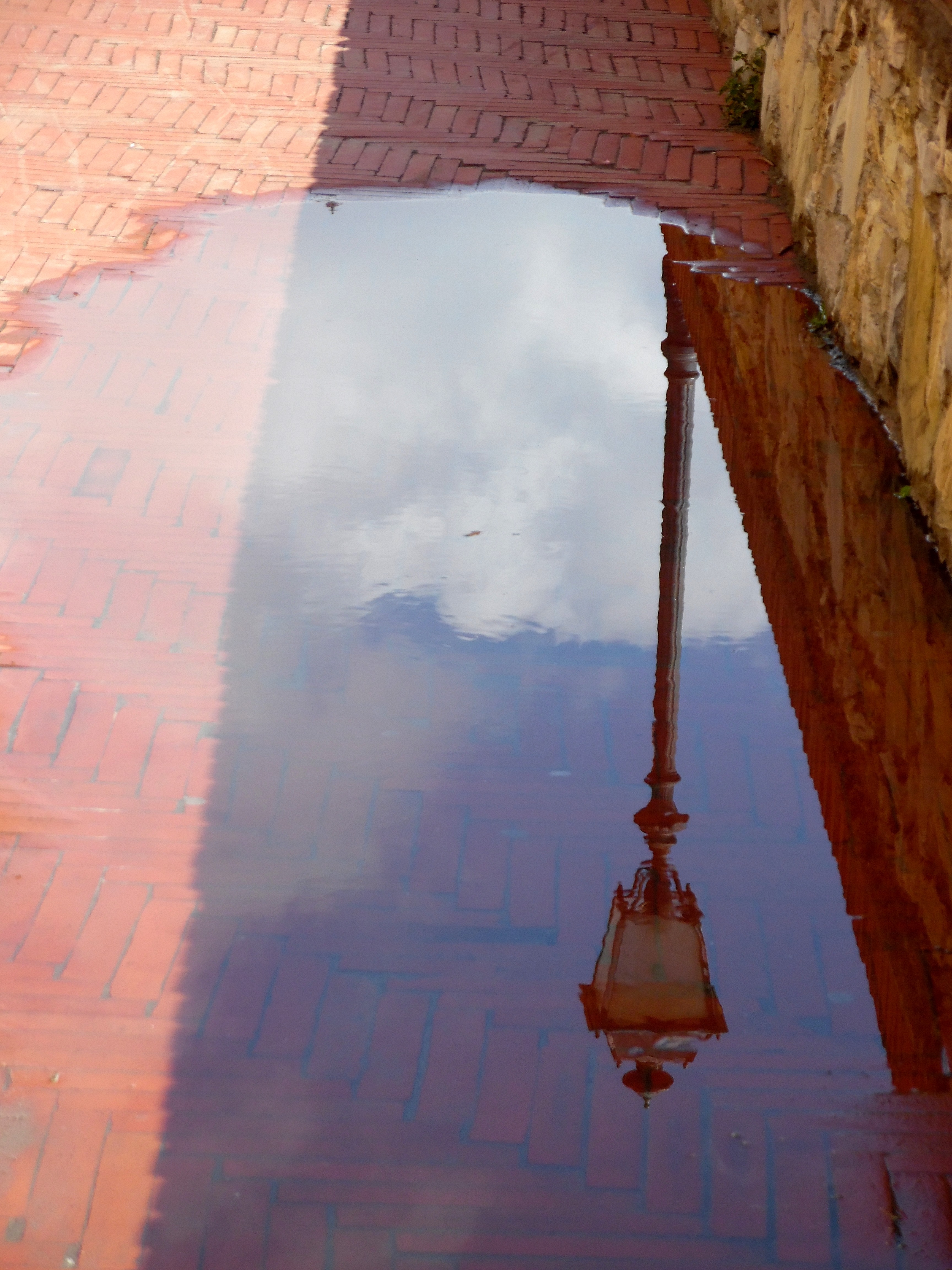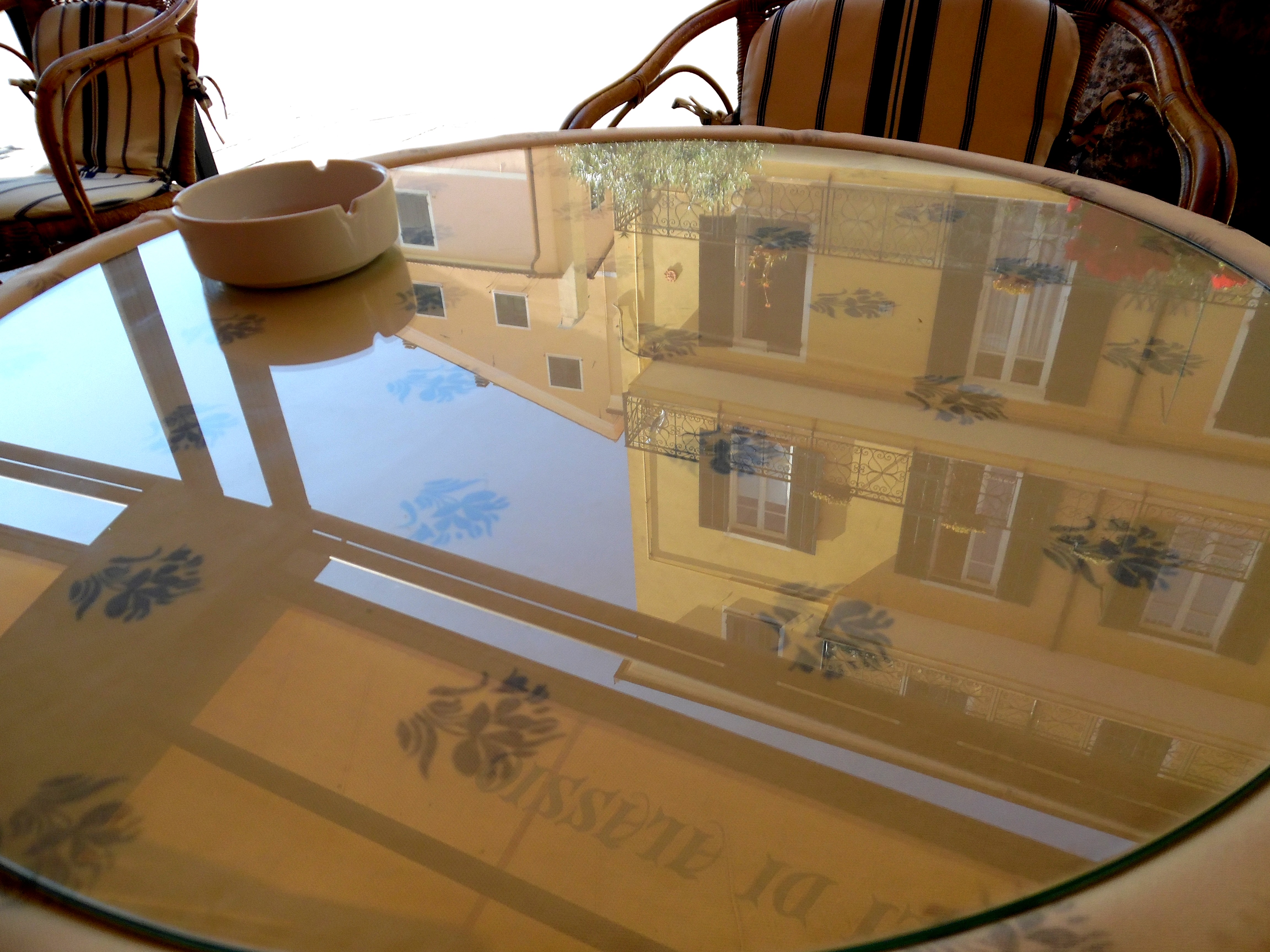 Spiegelungen des Himmels und eines Hauses auf der Glasplatte eines Tisches des Kaffees San Lorenzo in Alassio Réflexes du ciel et de la maison d´en face sur la surface vitrée du bar San Lorenzo à Alassio Riflessi del cielo e della casa di fronte sulla superficie vetrata di un tavolo del Café Pasticceria San Lorenzo, Alassio Reflections of the sky and of the house opposite the Bar San Lorenzo in the glass of the bar table. Arches, 300 g/m2 – 140 lb, 23×31 cm