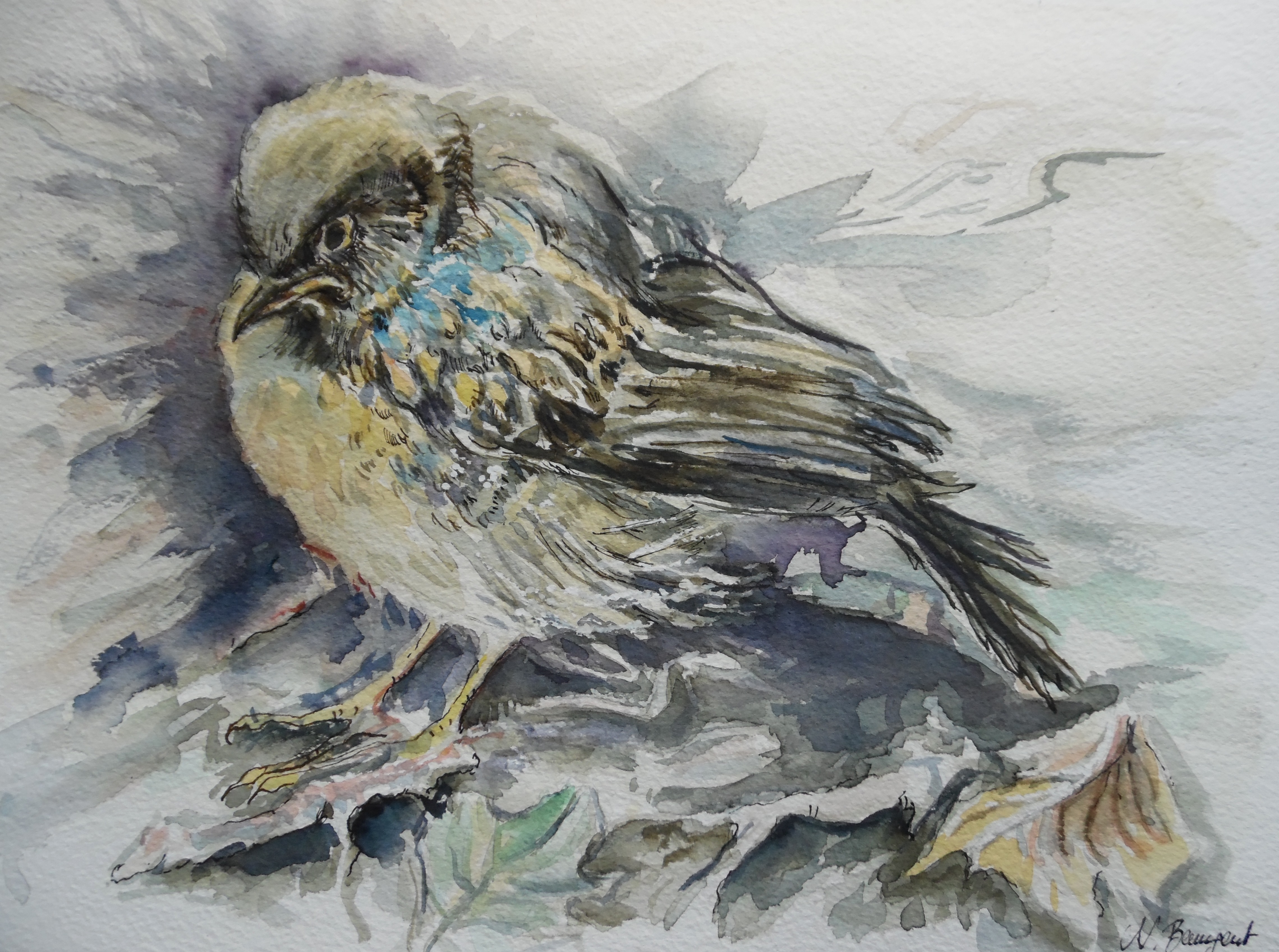 Gestern in der Nähe einer Quelle im Wald gesehen: ein Vögelchen, das sich wohl zum ersten Mal aus dem Nest getraut hat – Vu hier durant une promenade en forêt: un petit oiseau lors de sa première excursion en dehors du nid – From a photo taken yesterday in the forest: little bird that ventures out of the nest for the first time – Watercolour and ink on Arches paper