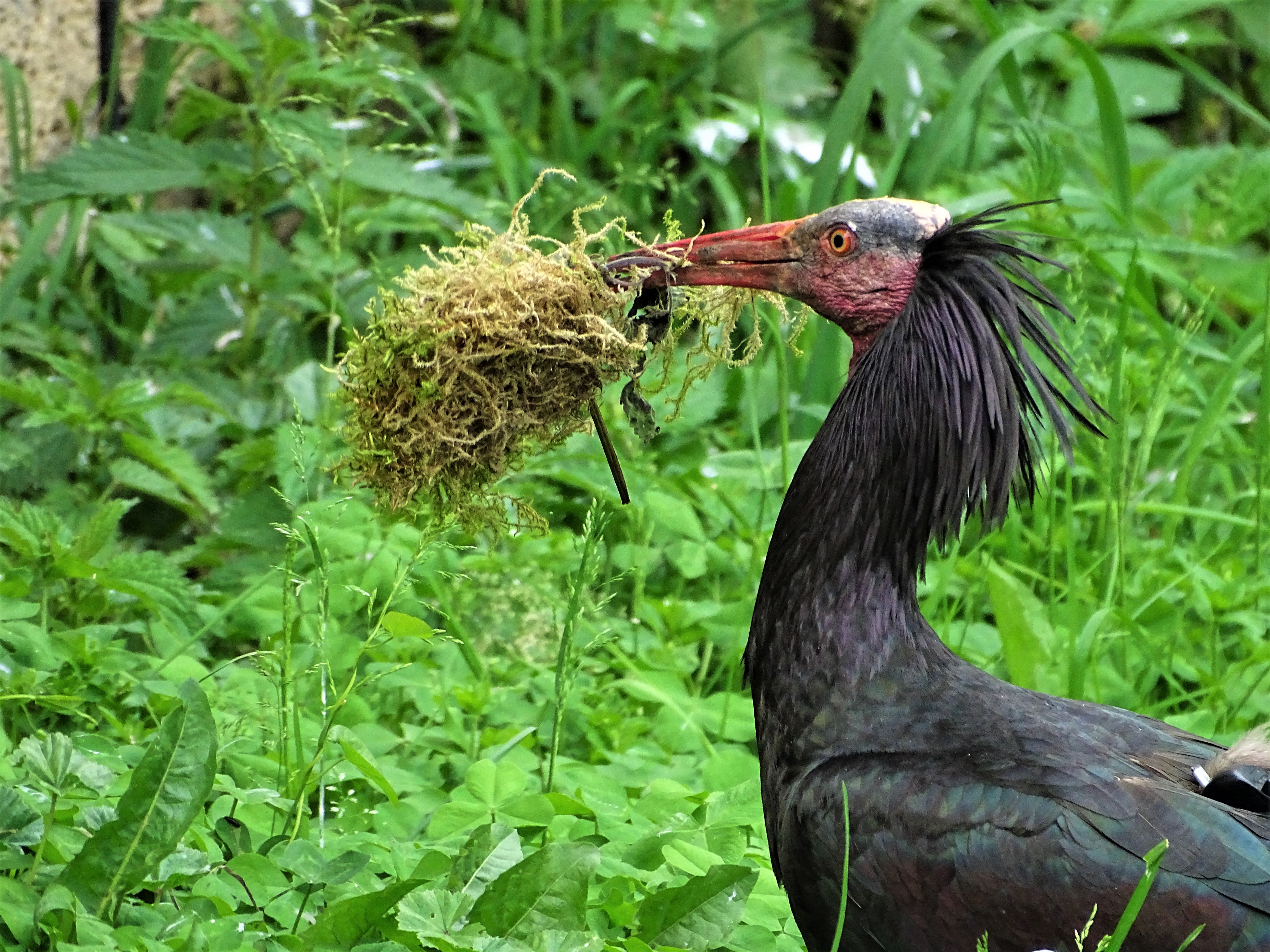 Der Waldrapp beim Sammeln von Nistmaterial in Burghausen