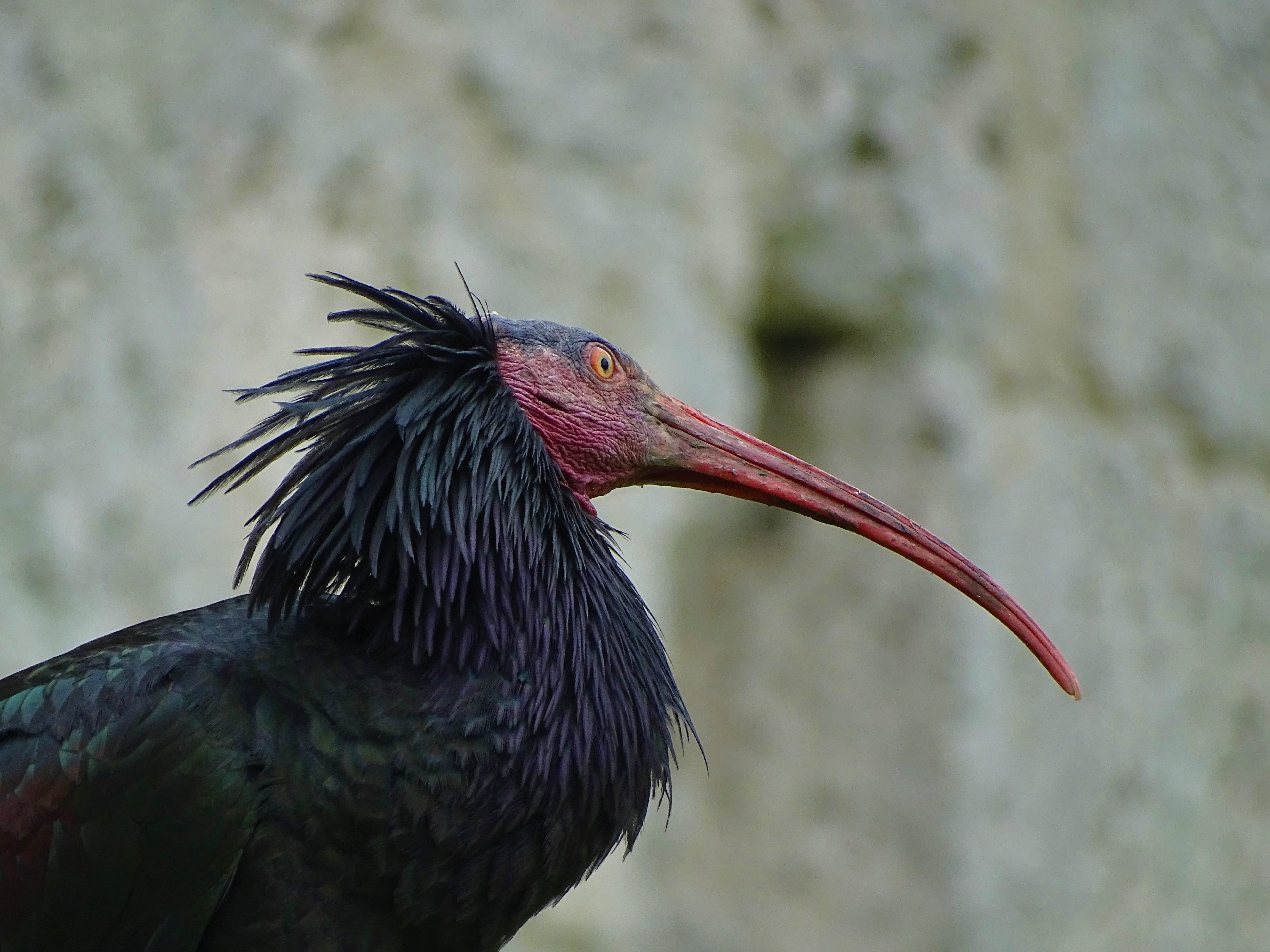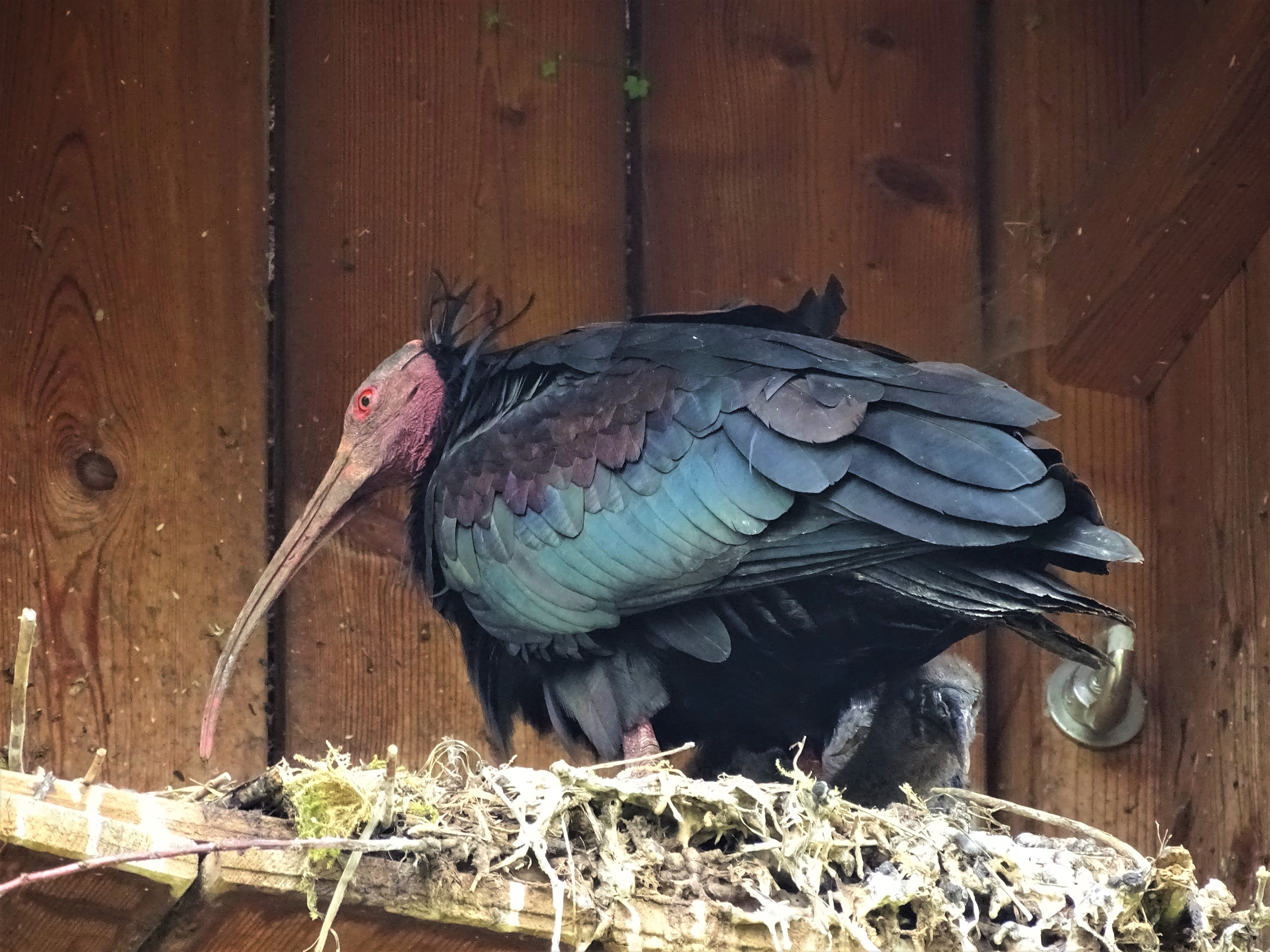 Hier schaut ein junger Waldrapp neugierig auf die Welt