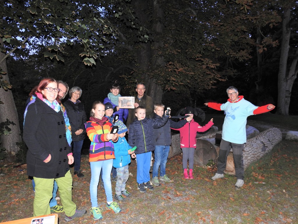 Nun ging es in den Lichtlberger Wald. Die Kinder hielten gespannt die Geräte in die Luft und hörten immer wieder das Rattern und Knattern der Fledermausrufe. „Bei Bartfledermäusen klingen sie wie das Ticken eines Geigerzählers, bei Abendseglern eher zwitschernd“, so Dr. Friemel. Immer wieder blieb man stehen, um zu horchen. Dabei wurden weitere Einzelheiten über das Verhalten der Säugetiere erläutert. Die Weibchen würden im Herbst begattet; die Befruchtung der Eizelle geschehe jedoch erst nach dem Winterschlaf bei günstigen Wetterverhältnissen. Die Weibchen richteten sogenannte „Wochenstuben“ ein. Häufig gebäre das Muttertier nur ein Junges, während es mit dem Kopf nach oben hänge. Das Neugeborene käme nackt und blind zur Welt und gleite dabei in die hochgewölbte Schwanzflughaut der Mutter. Nur etwa jedes zweite Junge überlebe. Da Fledermäuse 30 bis 35 Jahre alt werden können, sei es nicht einfach, Bestandsschwankungen rasch wahrzunehmen.