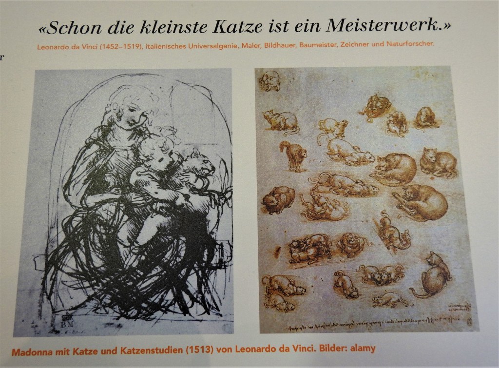 Leider ist es Katzen mit uns Menschen nicht immer gut gegangen. Heute gibt es Fälle von Tierquälerei; in der Nazizeit wurden Haustiere, die von Juden gehalten wurden, prinzipiell vernichtet. Auch die Kirche hat sich im Mittelalter Mühe gegeben, sie als Inbegriff des Weiblichen zu verteufeln. Schön, dass es dann bei Leonardo da Vinci schon wieder eine „Madonna mit Katze“ gab.