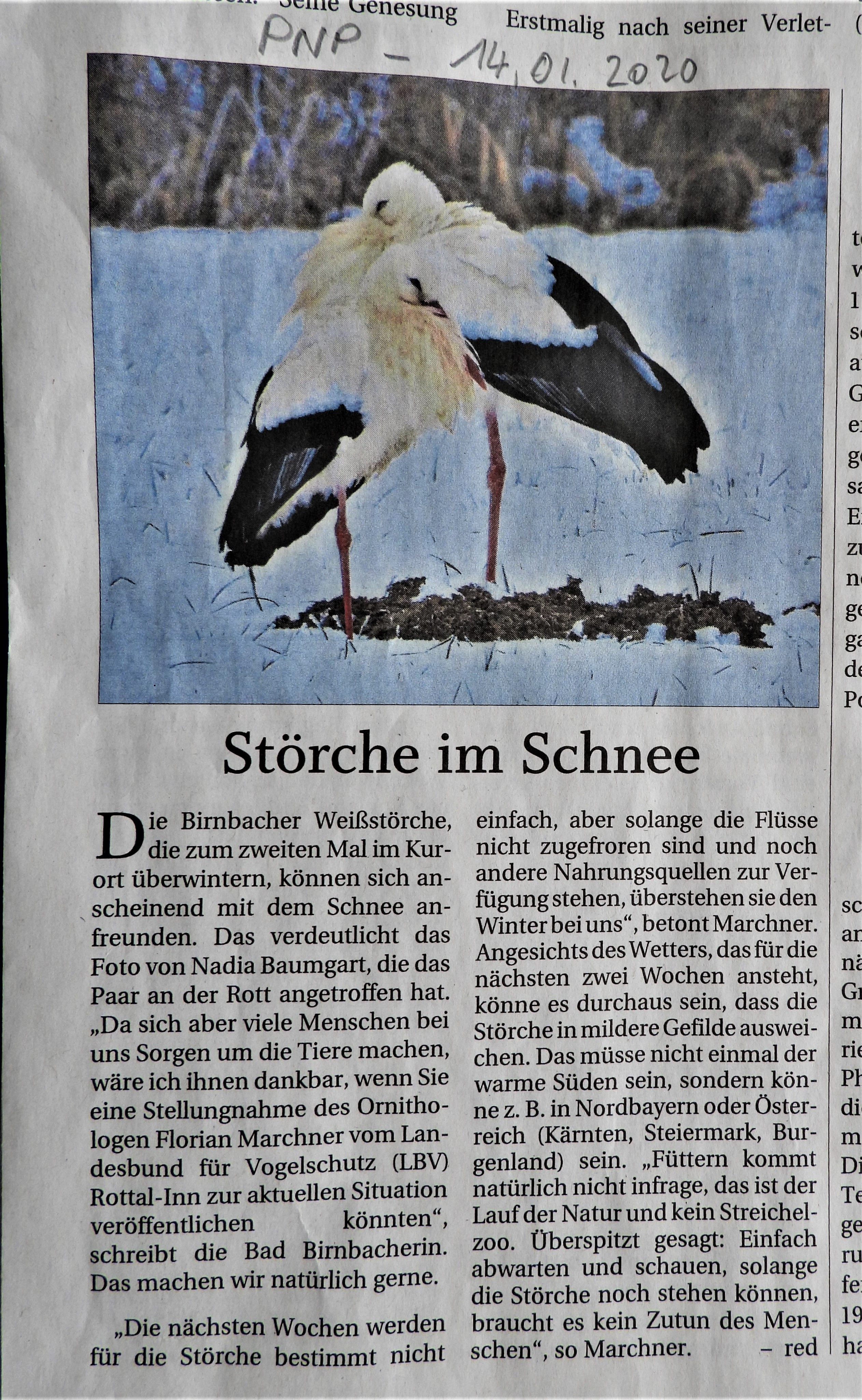 Die Birnbacher Stöche überwintern zum zweiten Mal bei uns. Heute sahen wir sie an der Rott im Schnee. Auf Anfrage äußerte sich der Ornithologe vom Landesbund für Vogelschutz Rottal-Inn zur aktuellen Situation: „Die nächsten Wochen werden für die Störche bestimmt nicht einfach, aber solange die Flüsse nicht zugefroren sind oder noch andere Nahrungsquellen zur Verfügung stehen, überstehen sie den Winter bei uns. Wenn ich mir das Wetter für die nächsten zwei Wochen ansehe, kann es durchaus sein, dass die Störche in mildere Gefilde ausweichen. Und das muss nicht einmal der warme Süden sein, sondern kann z. B. in (Nord-)Bayern oder Österreich (Kärnten, Steiermark, Burgenland, etc.) sein. Füttern kommt natürlich nicht in Frage, das ist der Lauf der Natur und kein Streichelzoo. Überspitzt gesagt: Einfach abwarten und schauen, solange die Störche noch stehen können braucht es kein Zutun des Menschen.“