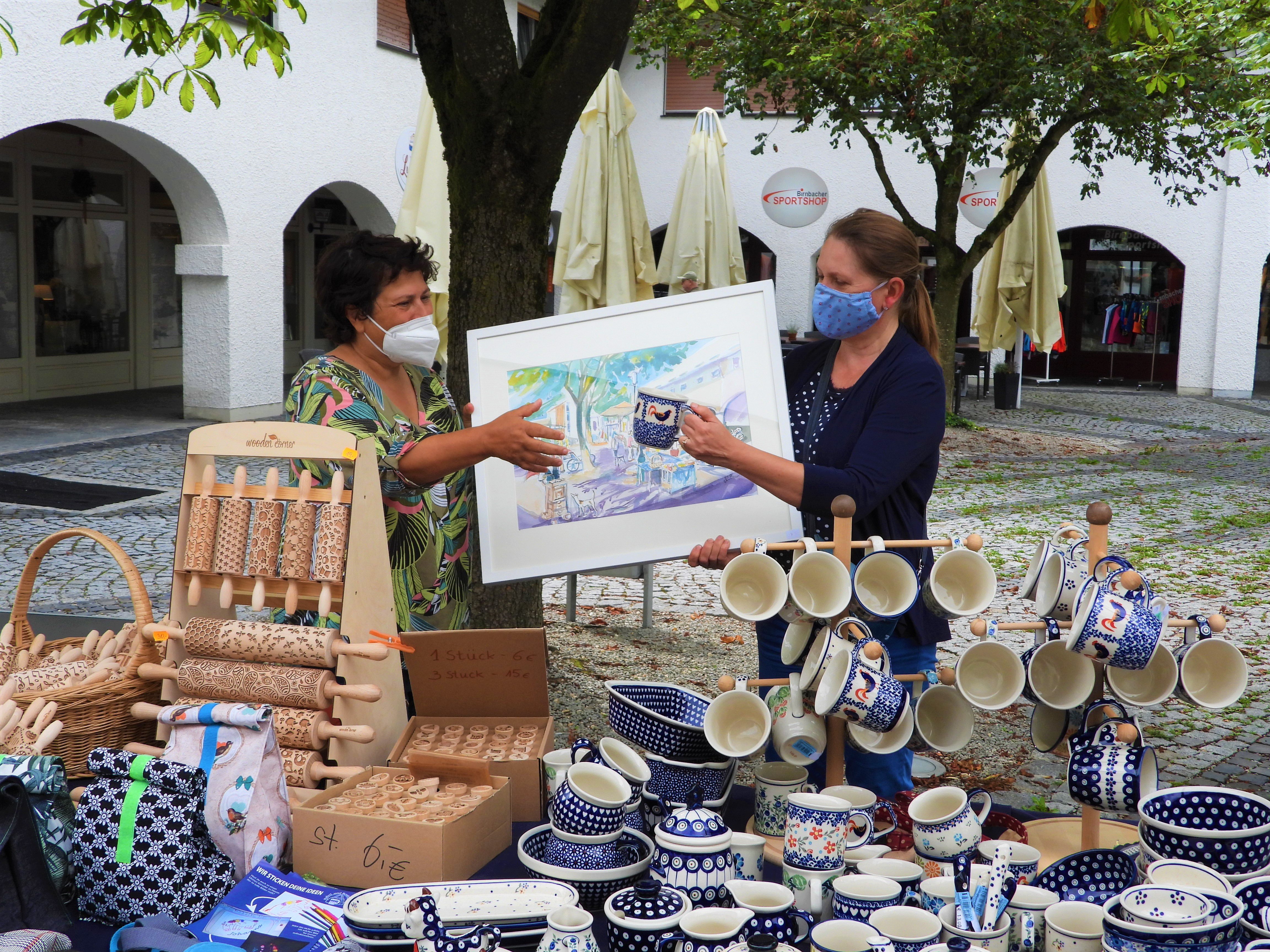 Tauschgeschäfte sind immer schön – und Kunst und Markt passen gut zusammen – Das Markt-Bild strahlt hoffentlich noch lange Freude aus. Heute habe ich das Markt-Aquarell an Izabela Eder übergeben und dafür wunderschöne Bunzlauer Keramik erhalten! Nach dem Motto: Kunst gegen Kunst! Kunst gehört nach draußen…