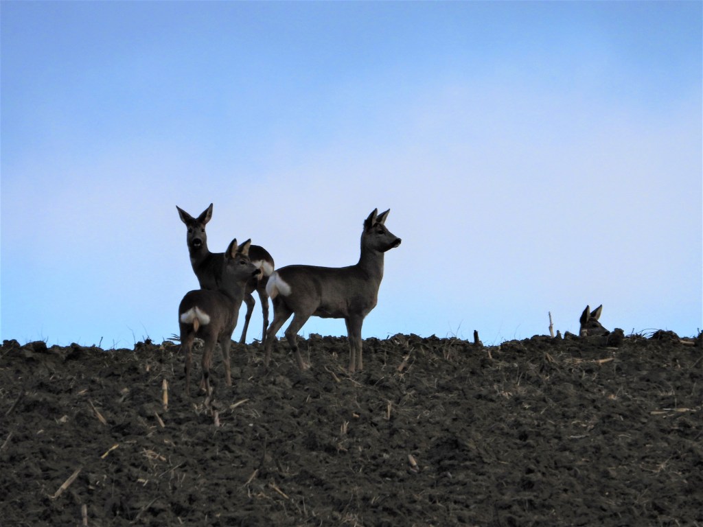 Heute fiel mir die Decke auf den Kopf…Alles grau in grau. Also nichts wie raus und…welche Freude, es waren Rehe unterwegs. Im Winter bilden sich „Sprünge“, das sind Gruppen, die mehrere Tiere umfassen. Scherenschnittartig stehen sie hier auf einem Hügel.
