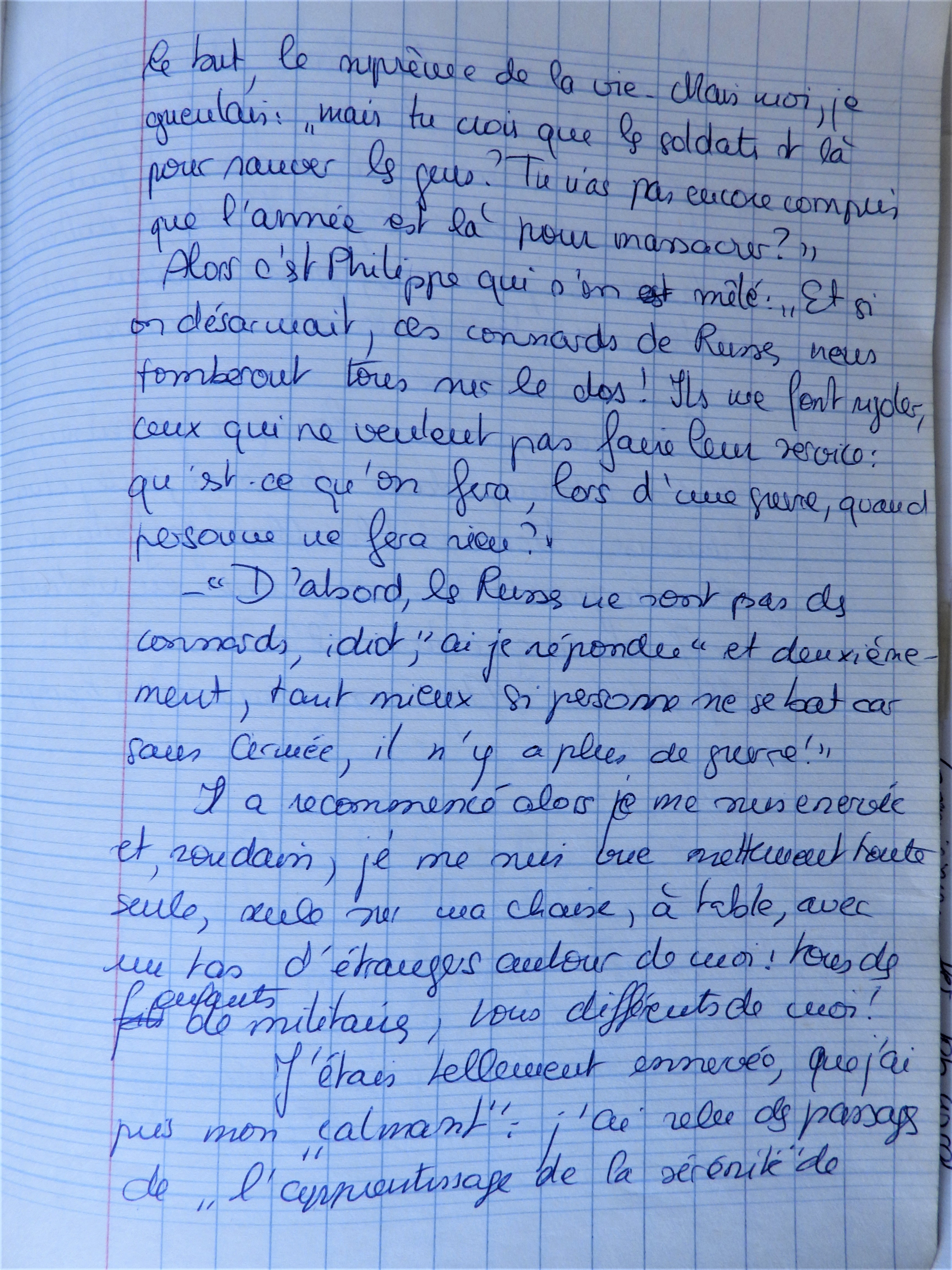 Als Jugendliche besuchte ich einige Jahre das Internat der französischen Streitkräfte in Deutschland. Dort waren die meisten meiner Schulkameraden Kinder von Militärs. Ich selbst fühlte mich fehl am Platz und war glühende Pazifistin. In meinem Tagebuch 1979 – ich war 18 Jahre alt – erzähle ich viel von meiner Abneigung der Armee gegenüber und von einer Diskussion mit Mitschülern während des Mittagsessens im Speisesaal.