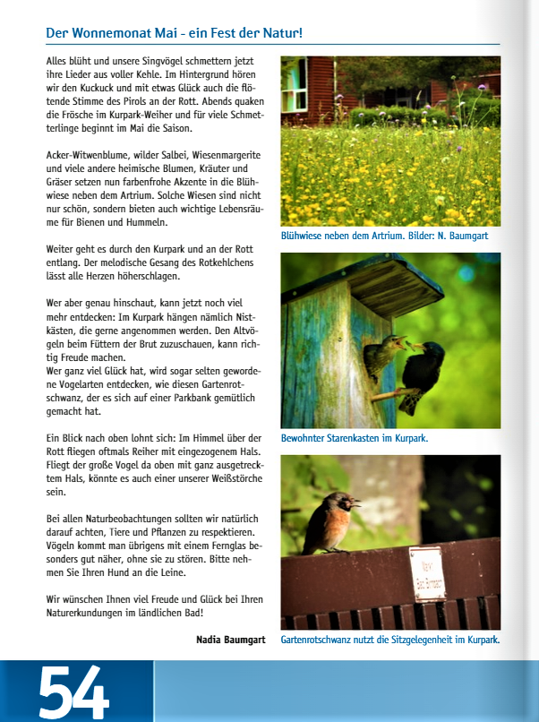 Alles blüht und unsere Singvögel schmettern jetzt ihre Lieder aus voller Kehle. Im Hintergrund hören wir den Kuckuck, und mit etwas Glück auch die flötende Stimme des Pirols an der Rott. Abends quaken die Frösche im Kurpark-Weiher, und für viele Schmetterlinge beginnt im Mai die Saison.