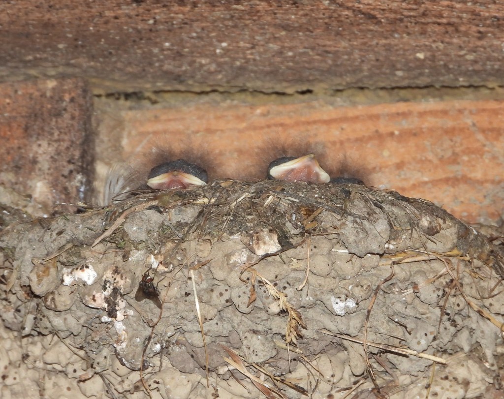 Auch die Rauchschwalben-Nester aus Schlammklümpchen sind voller nackter Schwalben-Küken. Hier ein Nest im Viehstall.