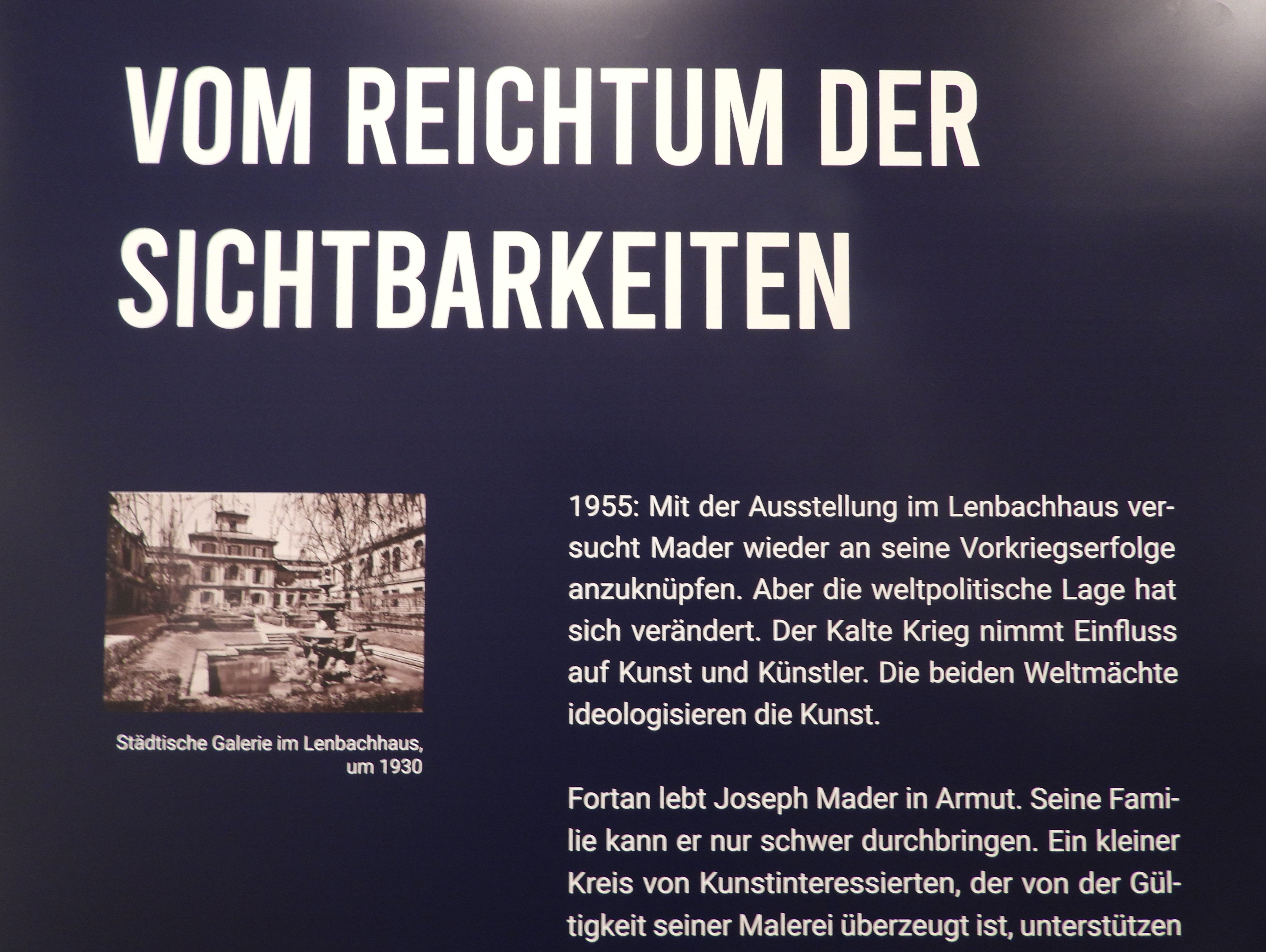 Der Enkel von Mader hat dafür gesorgt, dass dieser bedeutende, aber vergessene Künstler endlich wieder wahrgenommen wird. Denn er war lange vergessen.  Geboren wurde Joseph Mader 1905, sodass sein Kunststudium 1917 im ersten Weltkrieg begann. Als der Erfolg sich in den 30er Jahren einstellte, begann schon die „Kunstdiktatur“ der Nazis. Nach dem zweiten Weltkrieg wurde Malerei abstrakt, später wurden Pop Art und Aktionskunst zum Trend.