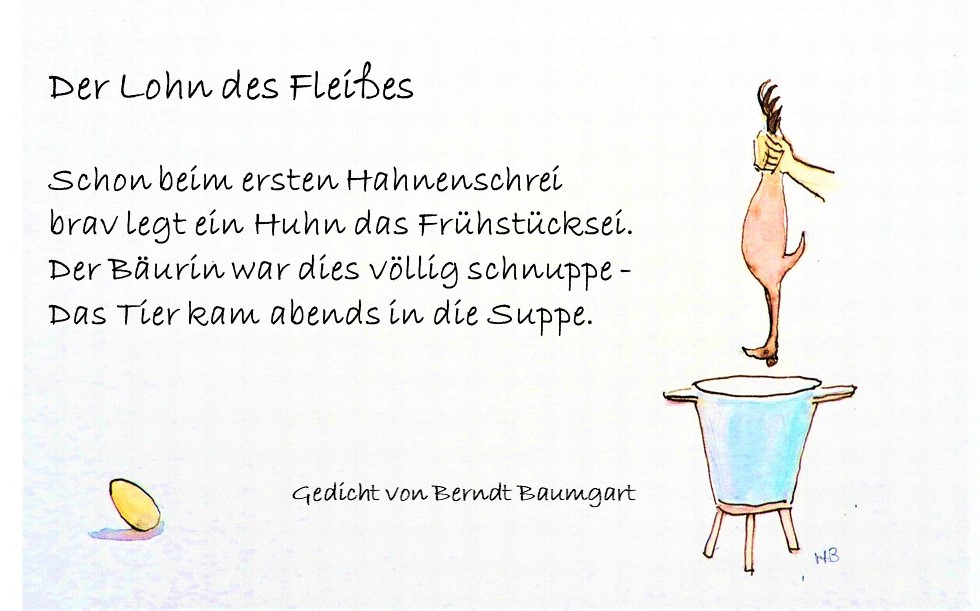 Es macht einfach großen Spaß, sowas zusammen zu machen, wenn auch nur zum privaten Gebrauch. Hier einige Gedichte, die wir dafür ausgewählt haben. Mal humorvoll und lustig, mal nachdenklich oder ironisch. Alle illustriert. Mehr davon gibt es in Berndts Blog: https://woher-wohin.com/