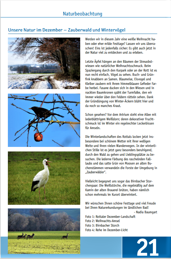 Letzte Äpfel hängen an den Bäumen der Streuobstwiesen wie natürlicher Weihnachtsschmuck. Beim Spaziergang durch den Kurpark oder an der Rott ist es nun recht einfach, Vögel zu sehen. Buch- und Grünfink knabbern an Samen; Blaumeise, Eisvogel und Kleiber zaubern mit ihrem himmelblauen Gefieder Farbe herbei. Fasane ducken sich in den Wiesen, und in nackten Baumkronen späht der Turmfalke, den wir immer wieder über den Feldern rütteln sehen. Dank der Gründüngung von Winter-Äckern blüht hier und da noch so manches Kraut.
