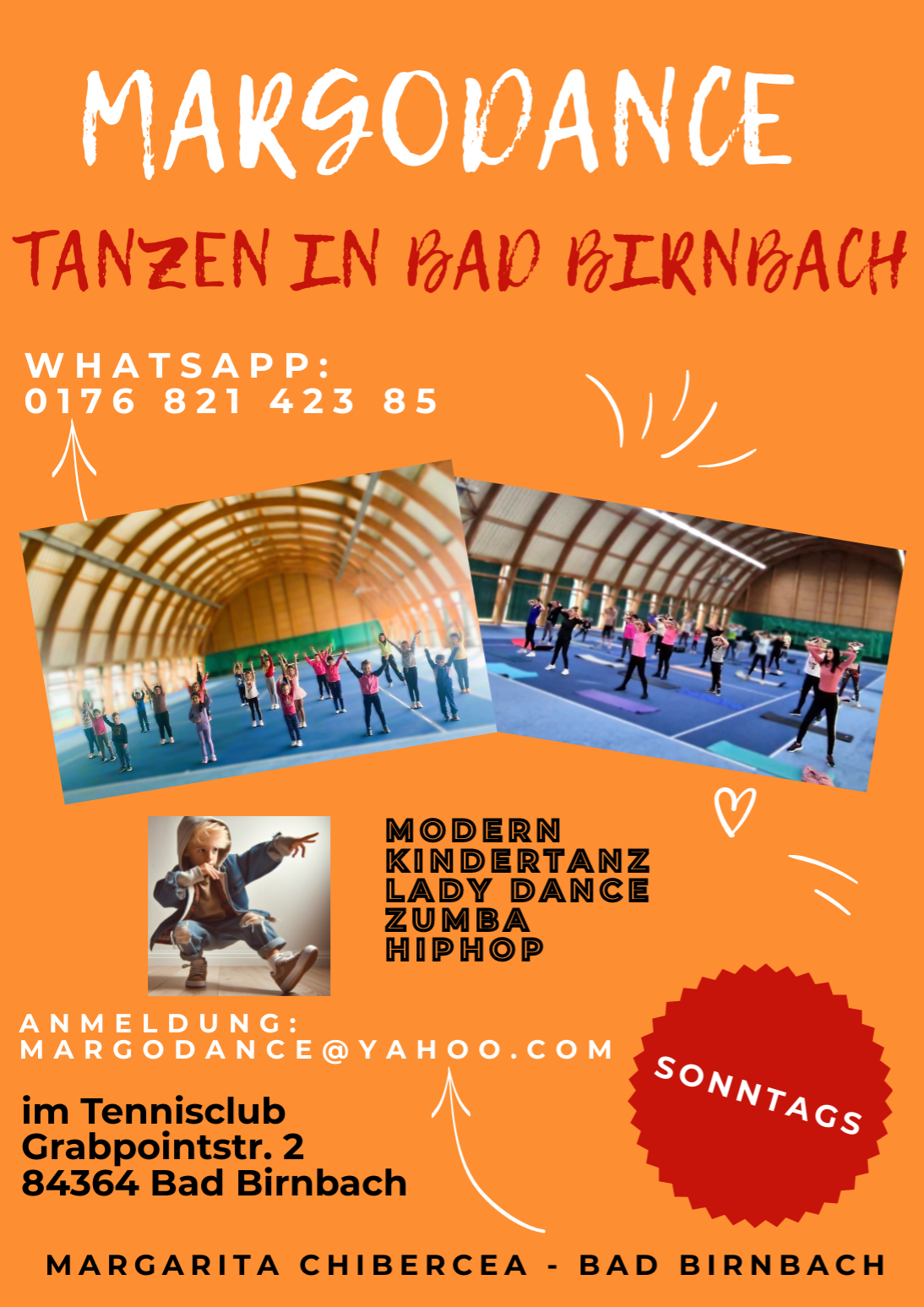 Inzwischen gibt sie sonntags im Tennisclub Bad Birnbach Tanzkurse für Kinder und Erwachsene: Lady Dance, Kindertanz, Street Dance, Hip Hop, Zumba, Bachata, Fitness…Wer Spaß an Bewegung hat, ist hier richtig! Schon zweimal ist ihre Jugendgruppe öffentlich auf der Bühne auf dem Birnbacher Marktplatz aufgetreten. Außerdem gibt sie ZUMBA-Kurse im Artrium ab dem 7.11.24. Ein einfacher Bewegungs-Mix zu heißer Musik von Margarita Chibercea.