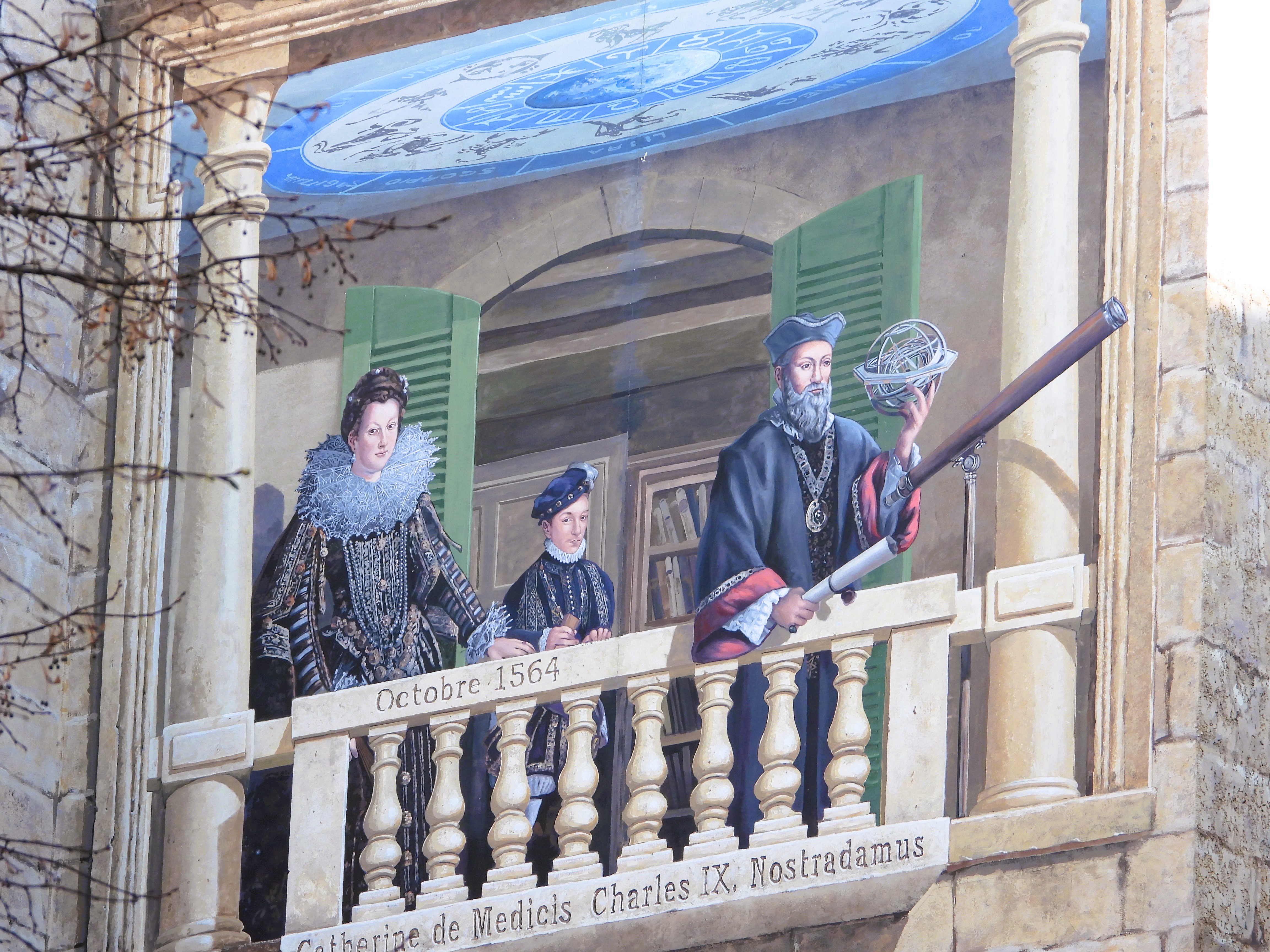 DE// Eher zufällig sind wir in dieser wunderschönen und lebendigen Kleinstadt gelandet. Zunächst fällt die große Burg aus dem 9. Jahrhundert die vom Felsen aus Stadt und Ebene dominiert. Dann das verspielte, dreistöckige Stadttor und die vielen Gassen. Und dann, Überraschung: Um die Ecke erscheint ein hohes Haus, auf dessen Fassade mehrere Gemälde angebracht wurden. Das obere zeigt Nostradamus in Begleitung von Katharina von Medici und ihrem Sohn König Karl IX. Nostradamus hat nämlich hier gelebt und war in der Nähe geboren. Das wusste ich nicht…