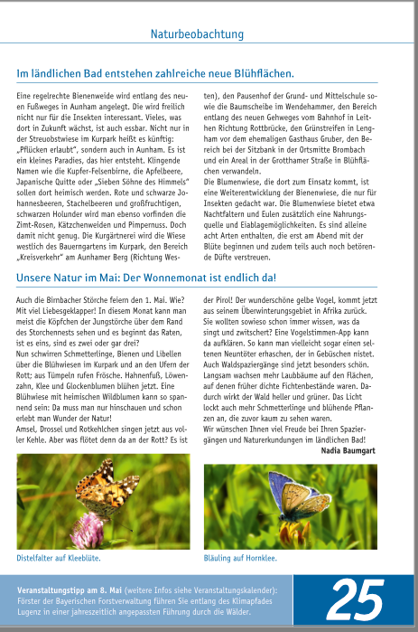 Nun schwirren Schmetterlinge, Bienen und Libellen über die Blühwiesen im Kurpark und an den Ufern der Rott; aus Tümpeln rufen Frösche. Hahnenfuß, Löwenzahn, Klee und Glockenblumen blühen jetzt. Eine Blühwiese mit heimischen Wildblumen kann so spannend sein: Da muss man nur hinschauen und schon erlebt man Wunder der Natur!