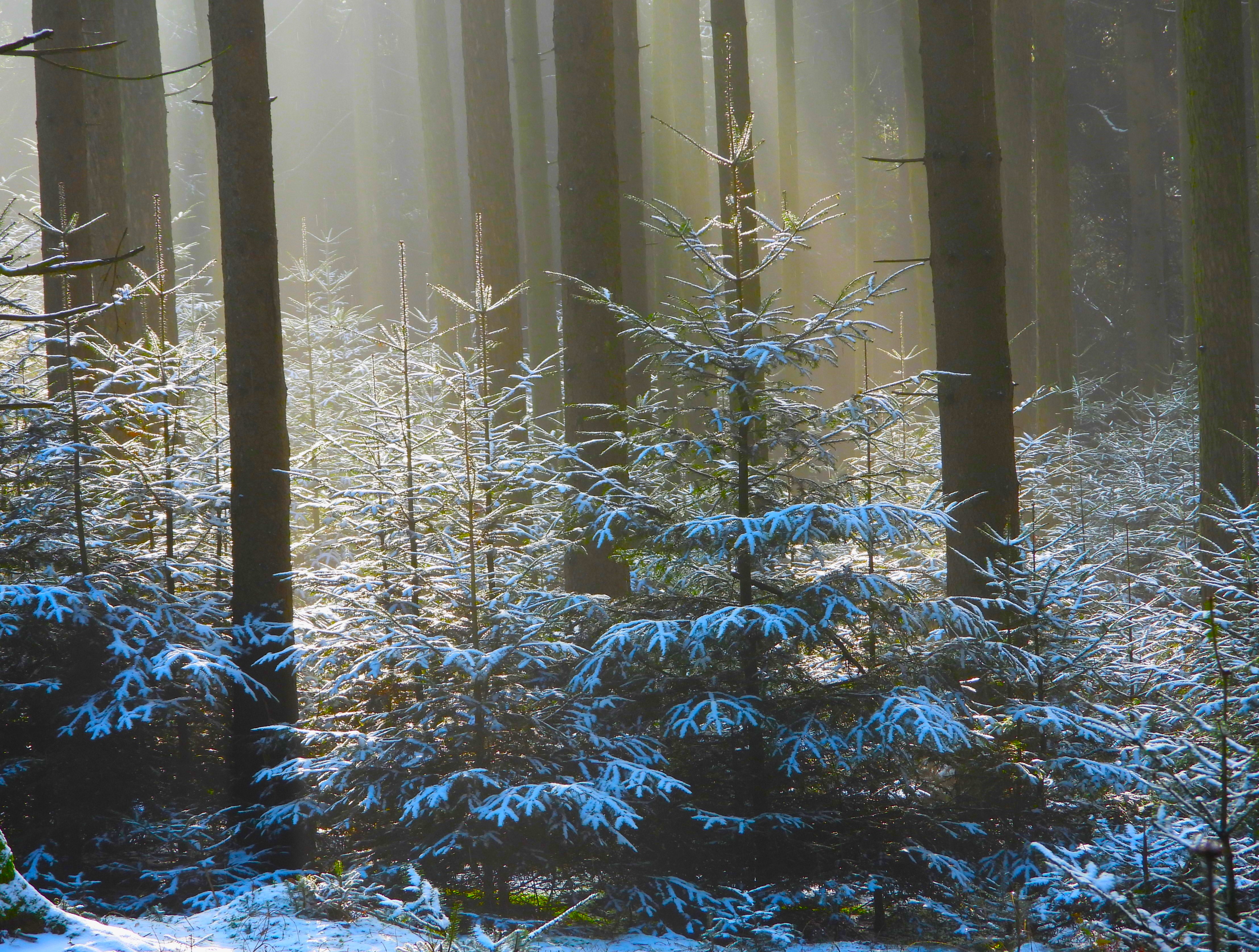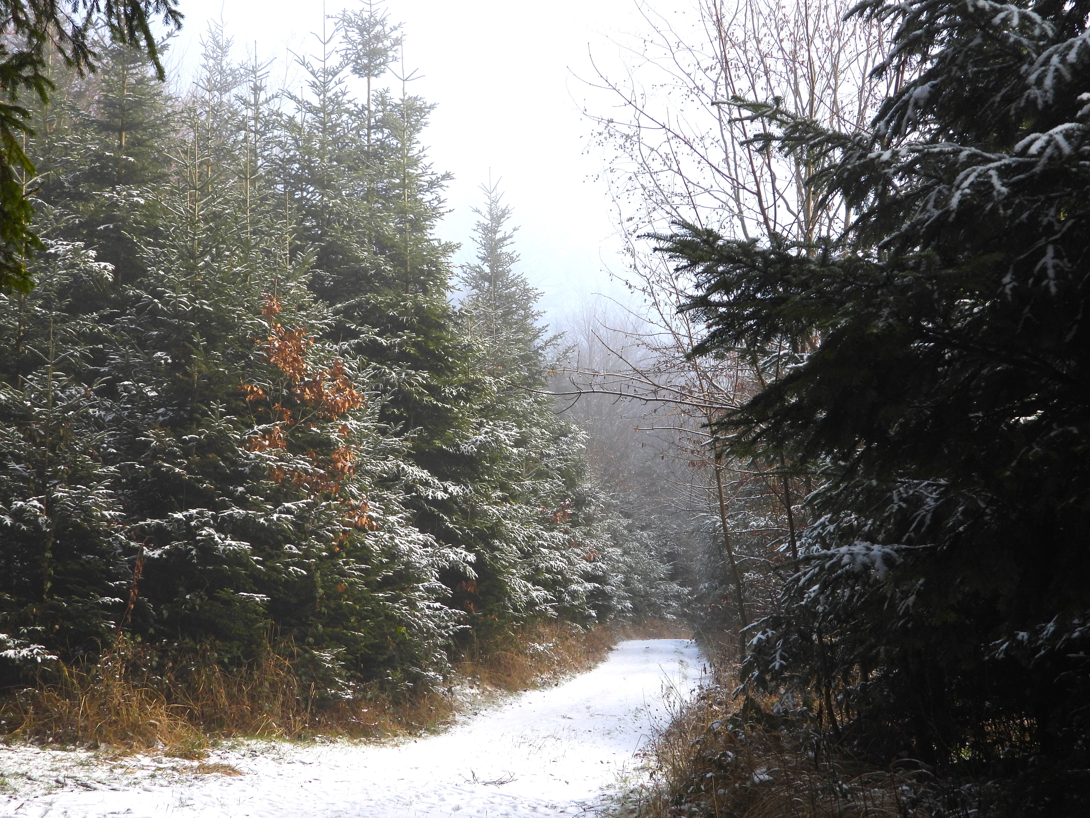 Mystisch und still: eingeschneite FichtenWeißer Puder auf grünen NadelnUnd die schöne Holzkapelle im Wald…