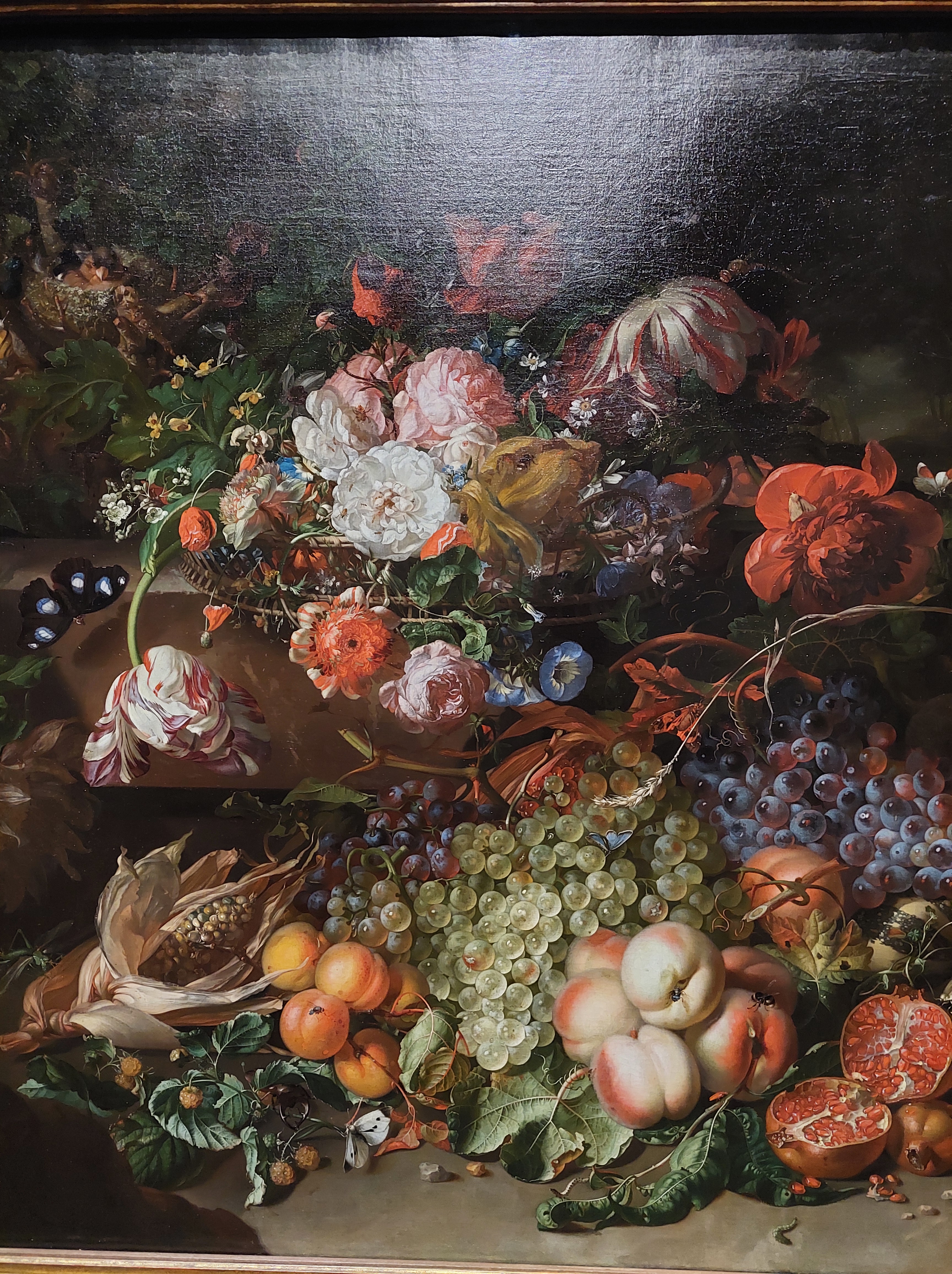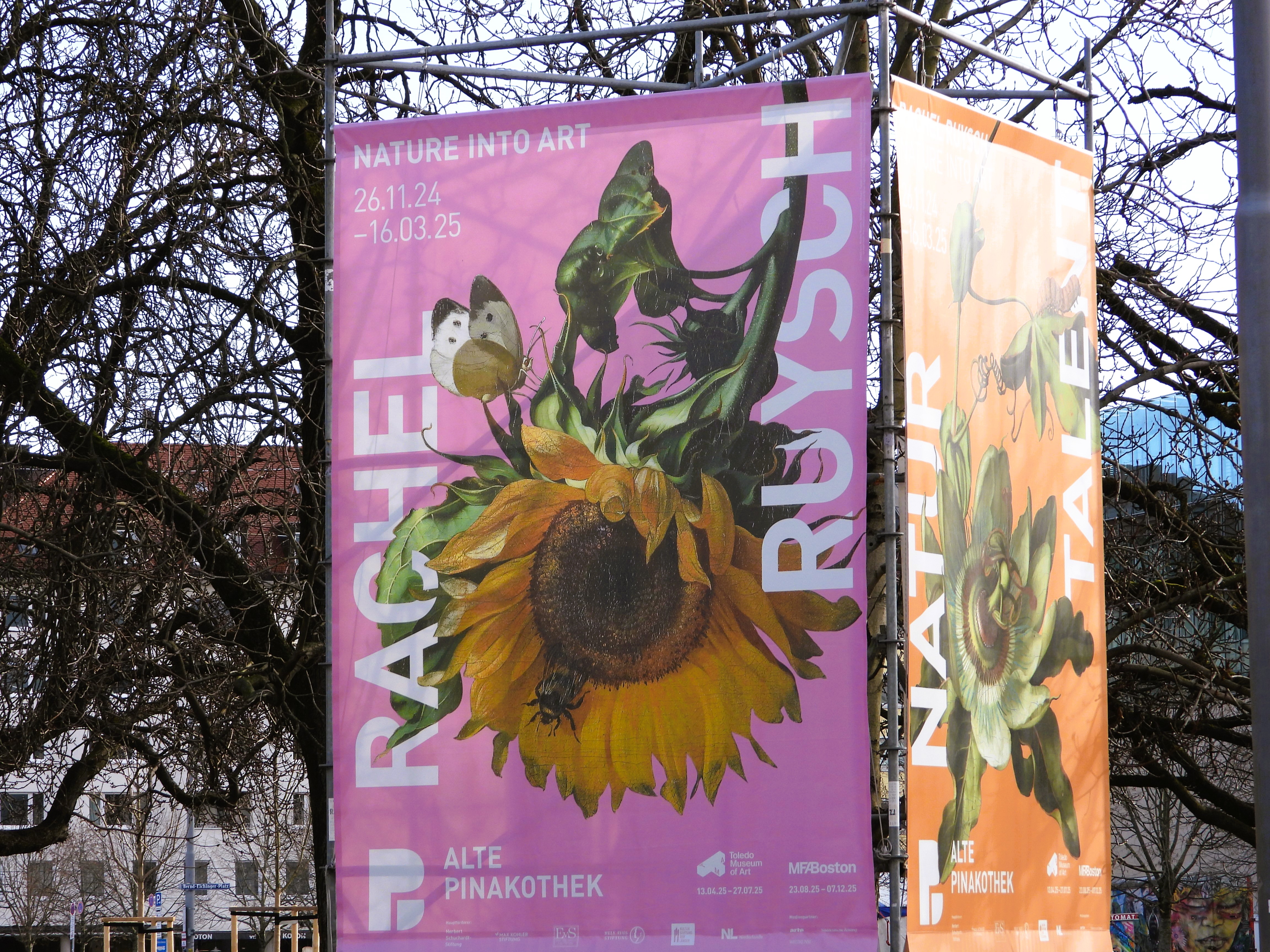 Wir haben uns die Sonderausstellung „Nature into Art“ in der Alten Pinakothek angeschaut. Es werden die Malereien der Malerin Rachel Ruysch (geboren 1664 in Den Haag) gezeigt. Es geht um üppige barocke Blumenmalerei.