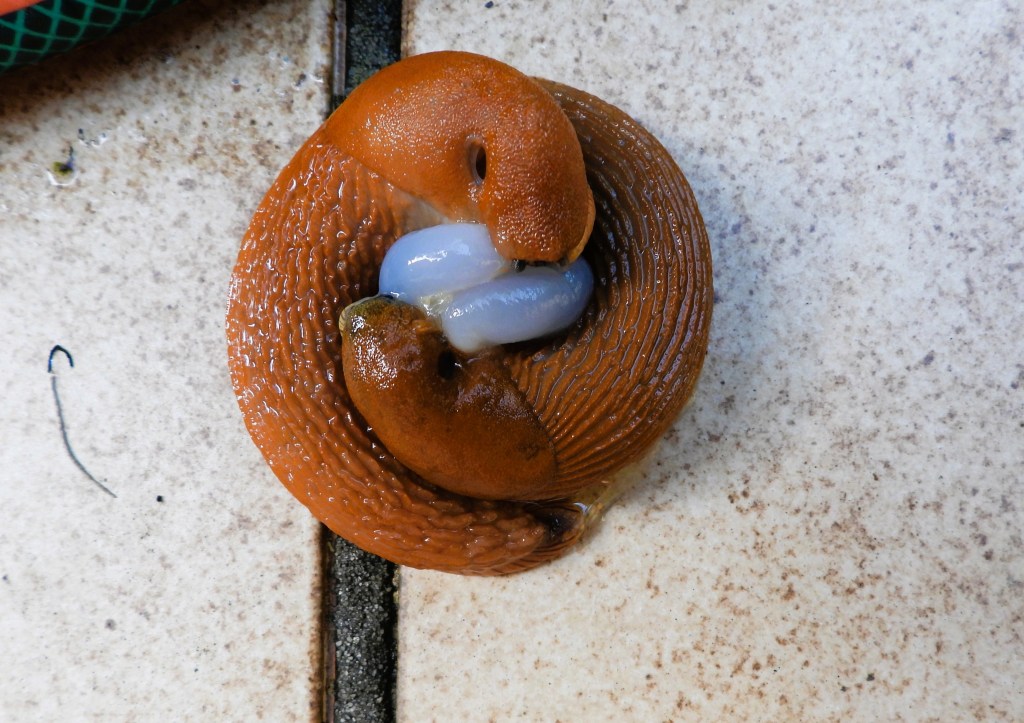 Sie wickeln sich umeinander in einer spiralförmigen Position. Beide Schnecken stülpen ihre Penisse aus, die oft weißlich oder bläulich schimmern. In der Mitte der Spiralform kommt es zur Übertragung von Sperma – das sind die „Schleimpakete“, die man hier sieht.
