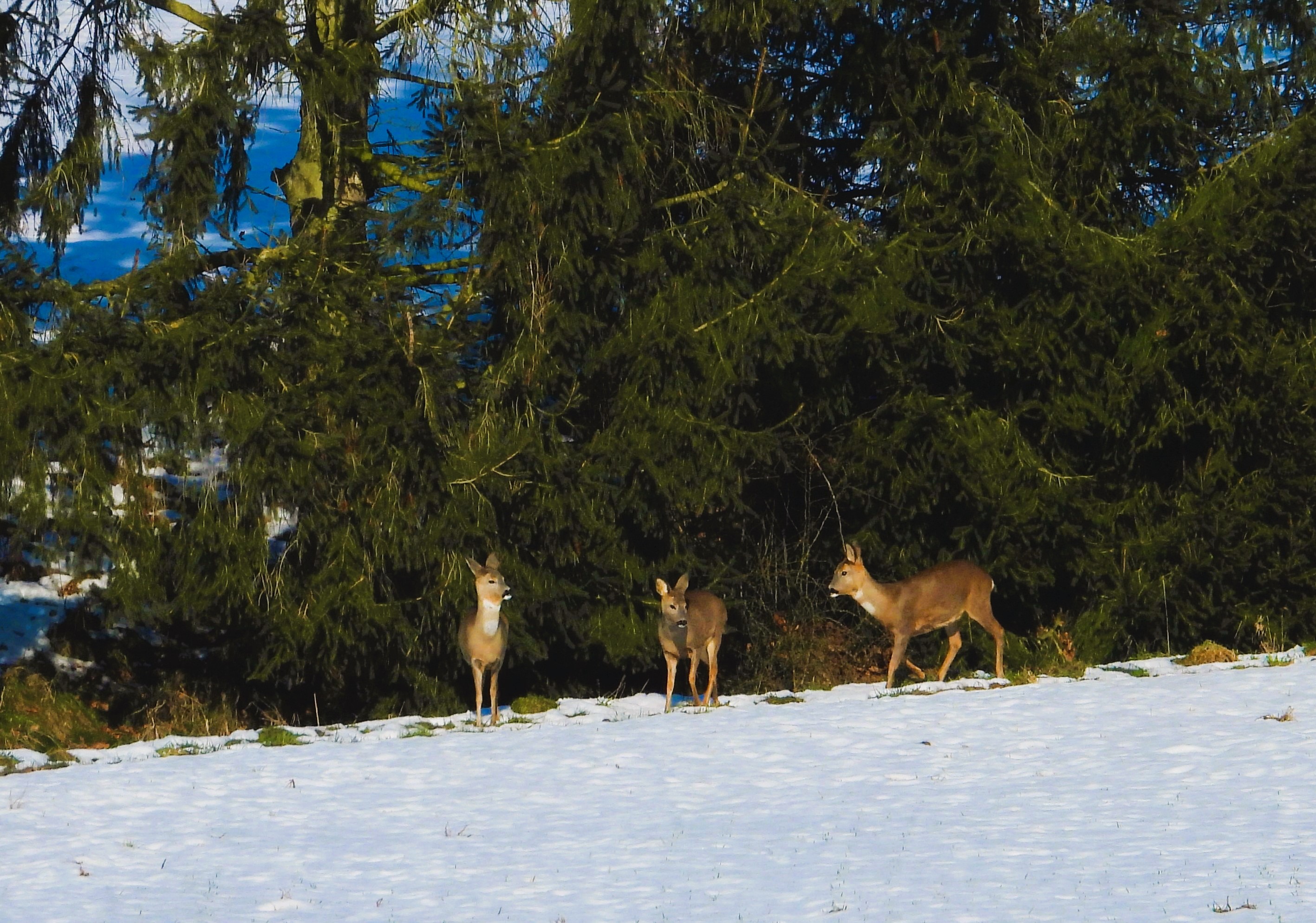 Drei Rehe stehen auf einer schneebedeckten Wiese vor einer dichten Nadelbaumkulisse.