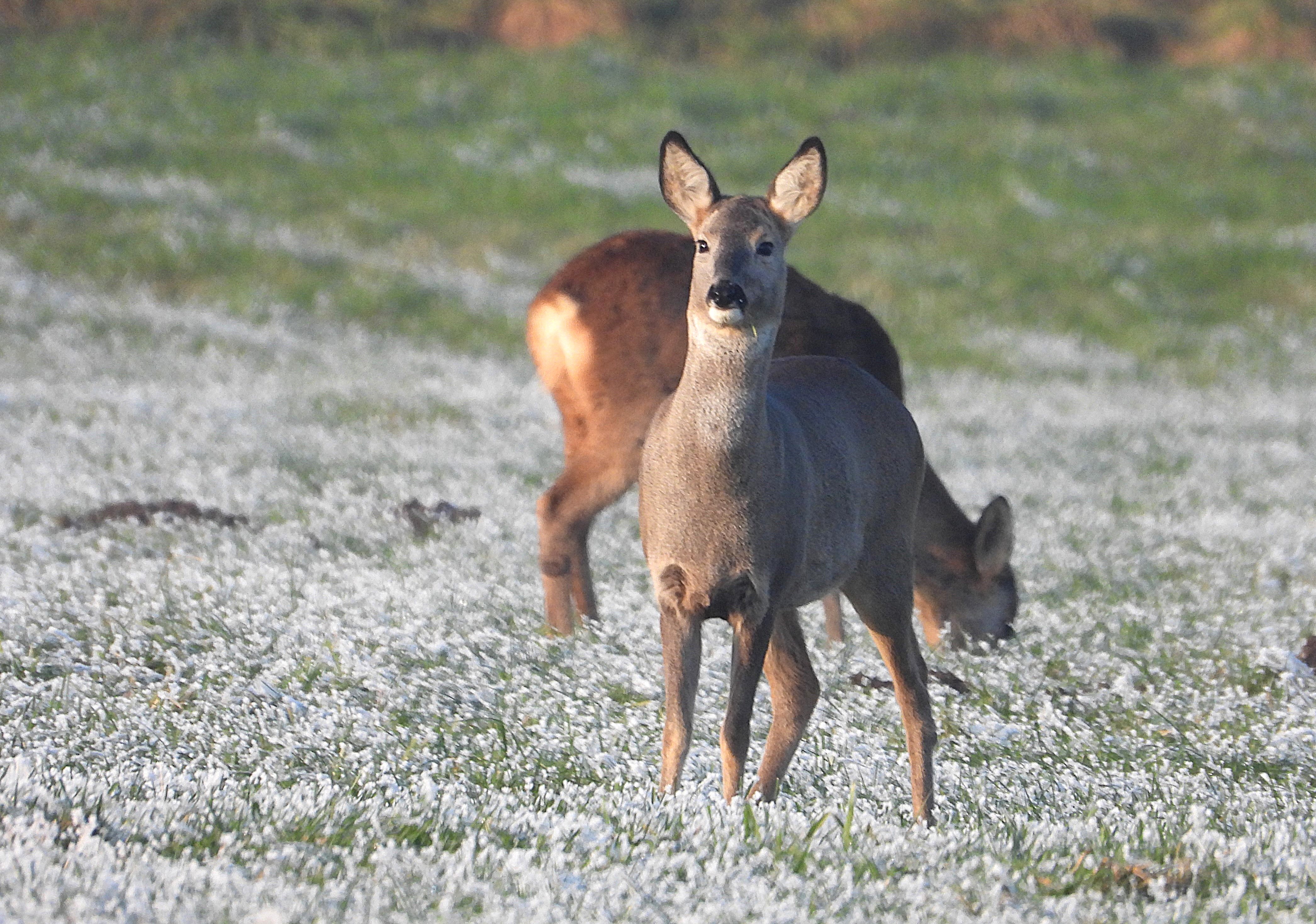 Rehe bilden im Winter größere Gruppen, sogenannte „Sprünge“. Feldhasen sind jetzt auf abgeernteten Feldern zu sehen. Hat es geschneit? Dann ist spannend, nach Spuren im Gelände zu suchen, die Anwesenheit weiterer Tiere wie Füchse oder Greifvögel verraten. Wer aufmerksam unterwegs ist, kann auch so die Vielfalt der heimischen Fauna erkennen.