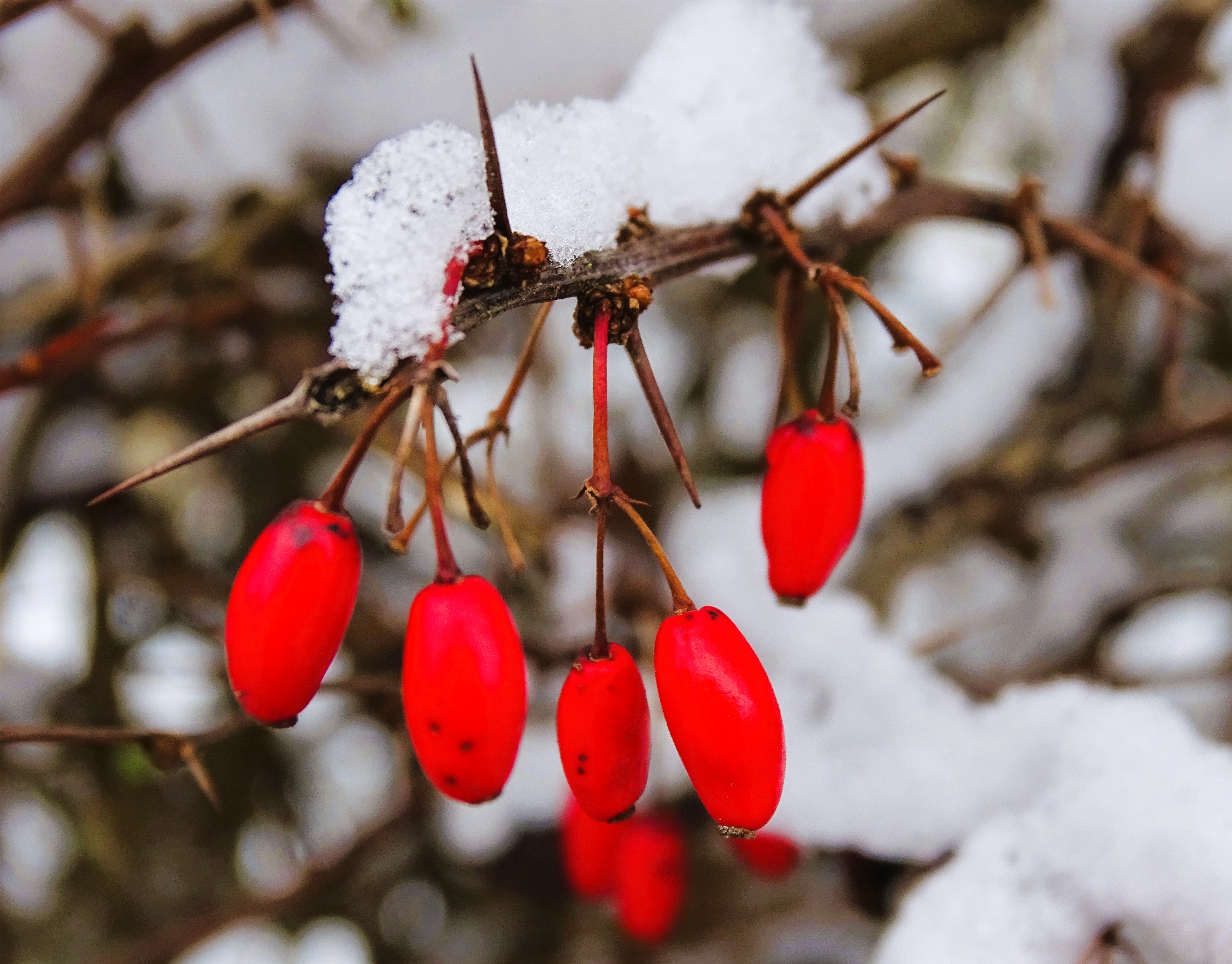 Nahaufnahme von roten Vogelbeeren, die an einem gefrorenen Ast hängen, mit Schnee darauf.
