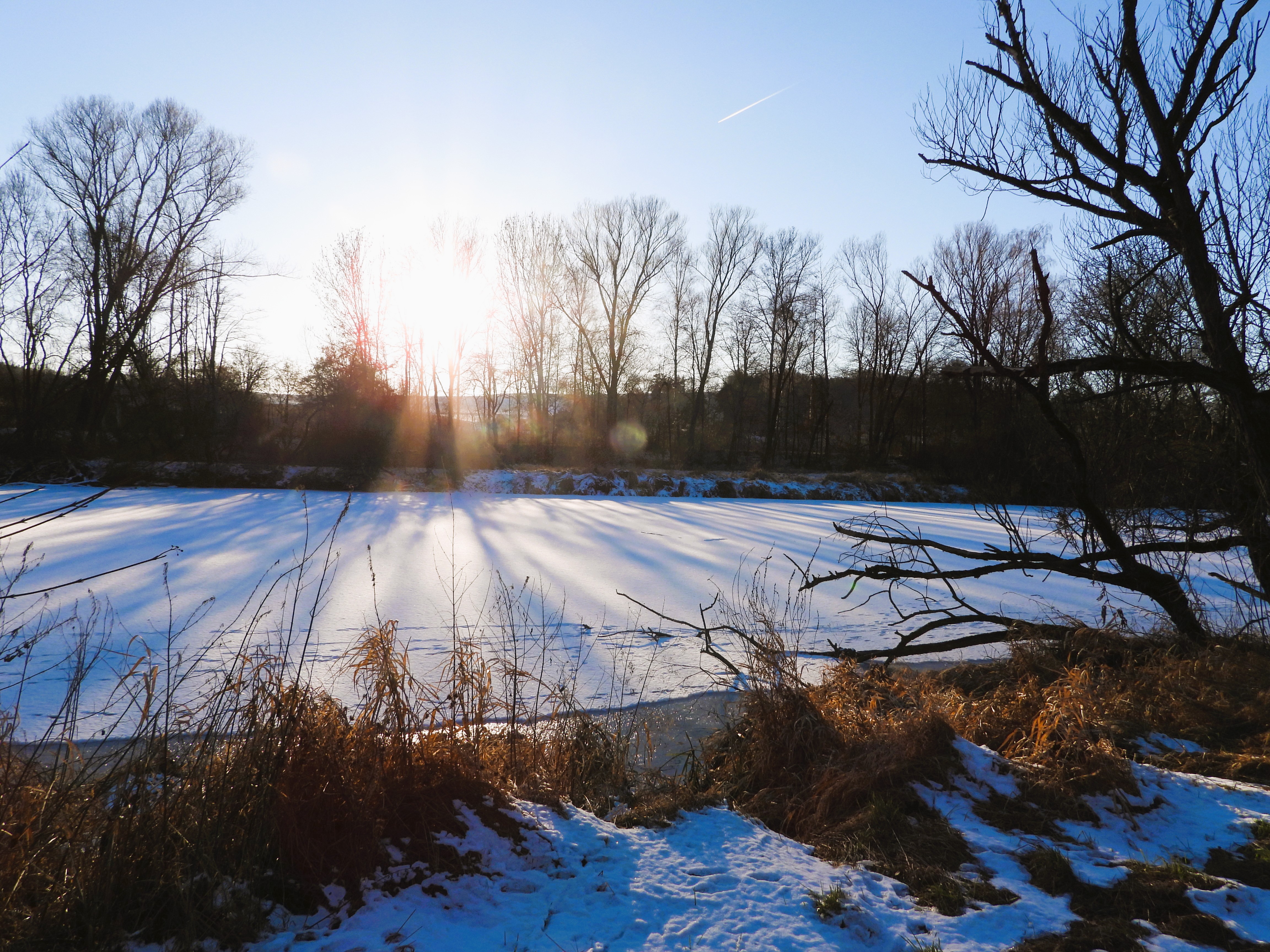 Welch ein Glück! Plötzlich landete in der Wintersonne ein schillernder Eisvogel direkt vor mir auf dem Zaunpfahl am Birnbach und ließ sich ruhig ablichten. Ich stand im Schatten und so nahm er mich nicht wahr.