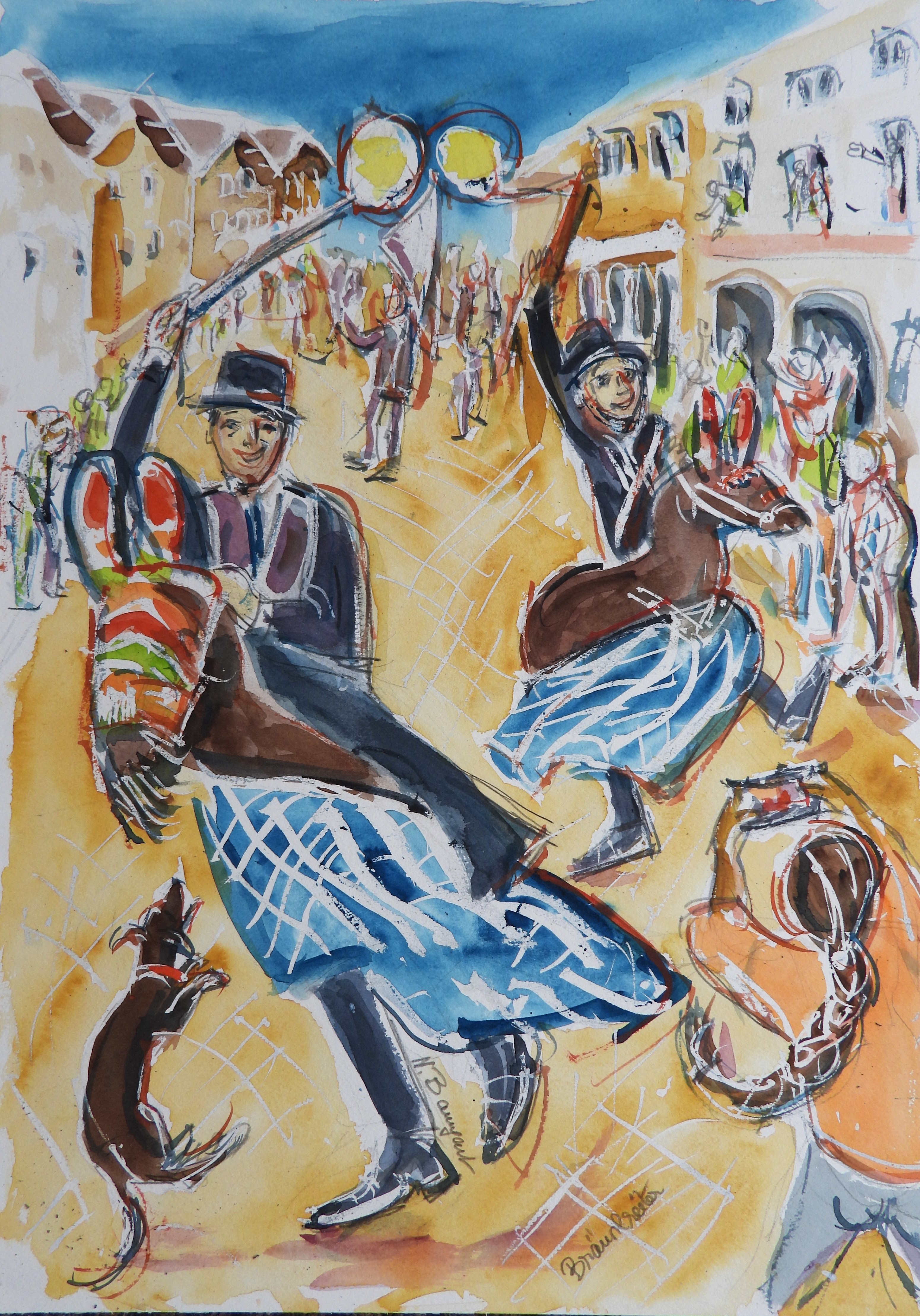 Eine farbenfrohe Wassermalerei, die eine festliche Szenerie zeigt, in der tanzende Figuren in traditioneller Kleidung mit Tuch und Stock dargestellt sind. Im Vordergrund ist ein Hund zu sehen, während im Hintergrund Menschen und historische Gebäude versammelt sind.