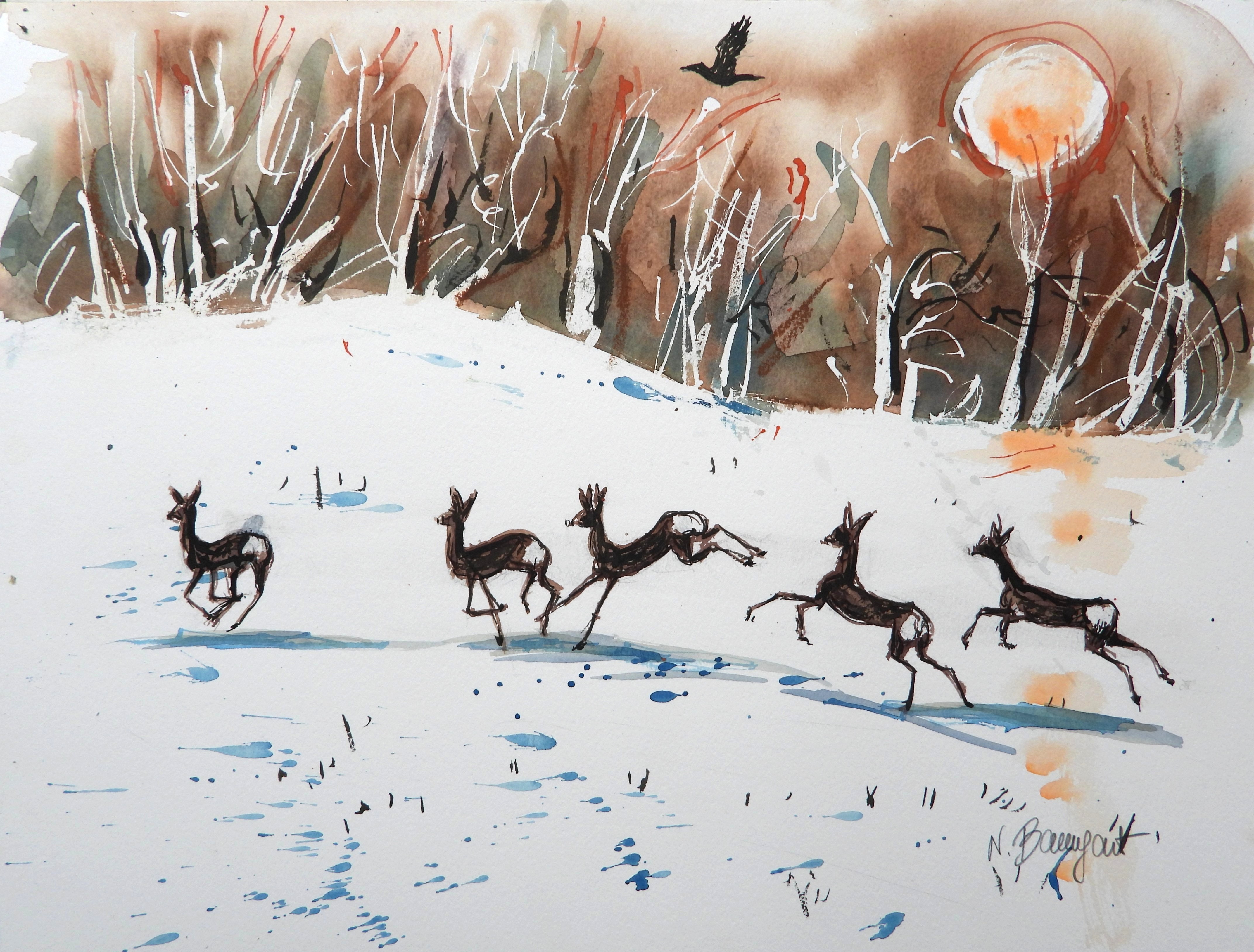 Aquarellmalerei von einer Gruppe von Rehen, die durch eine schneebedeckte Landschaft springen, mit schneebedeckten Bäumen im Hintergrund und einer untergehenden Sonne.