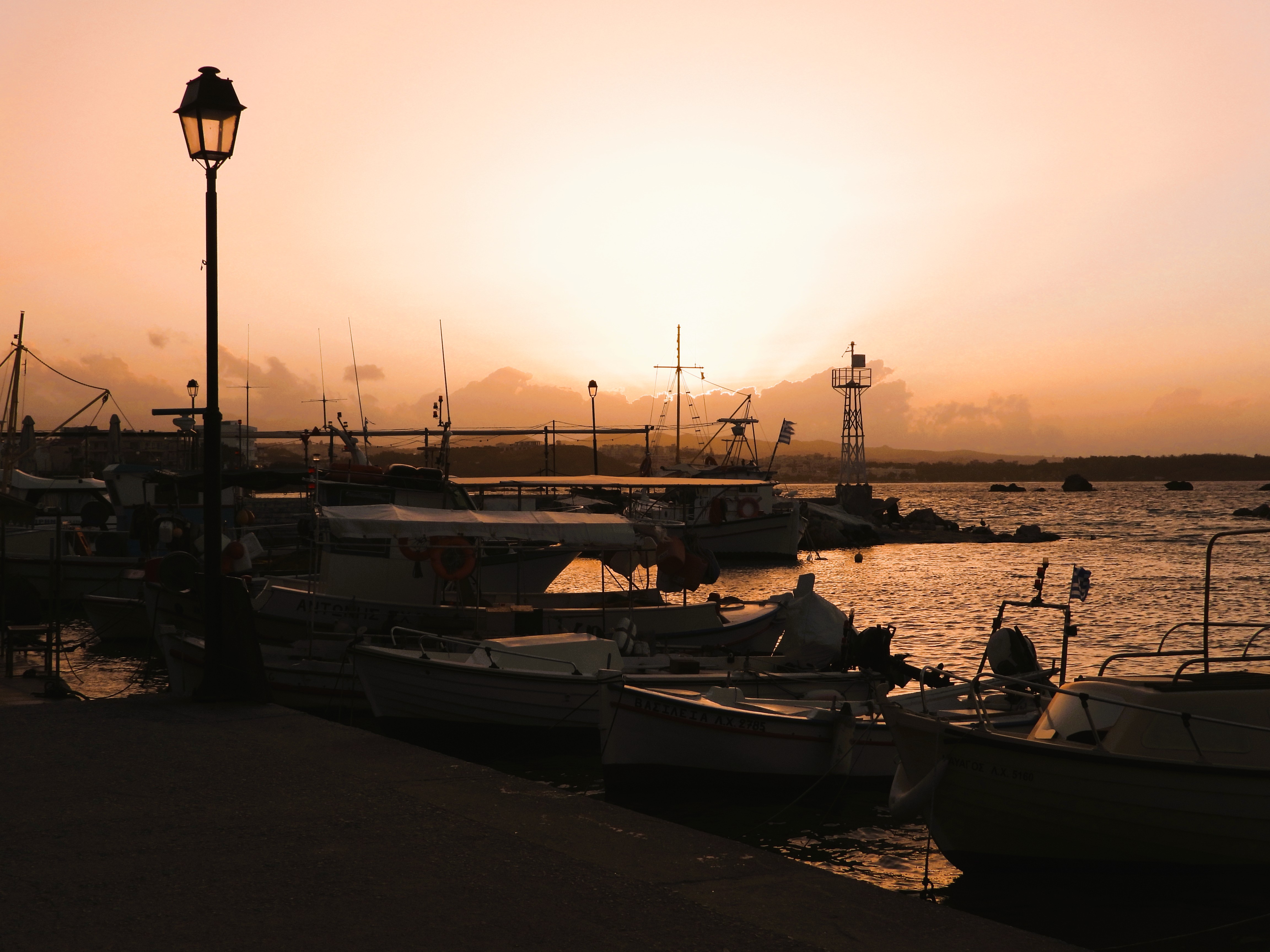 Sonnenuntergang über einem Hafen mit mehreren Booten und einem Laternenpfahl.