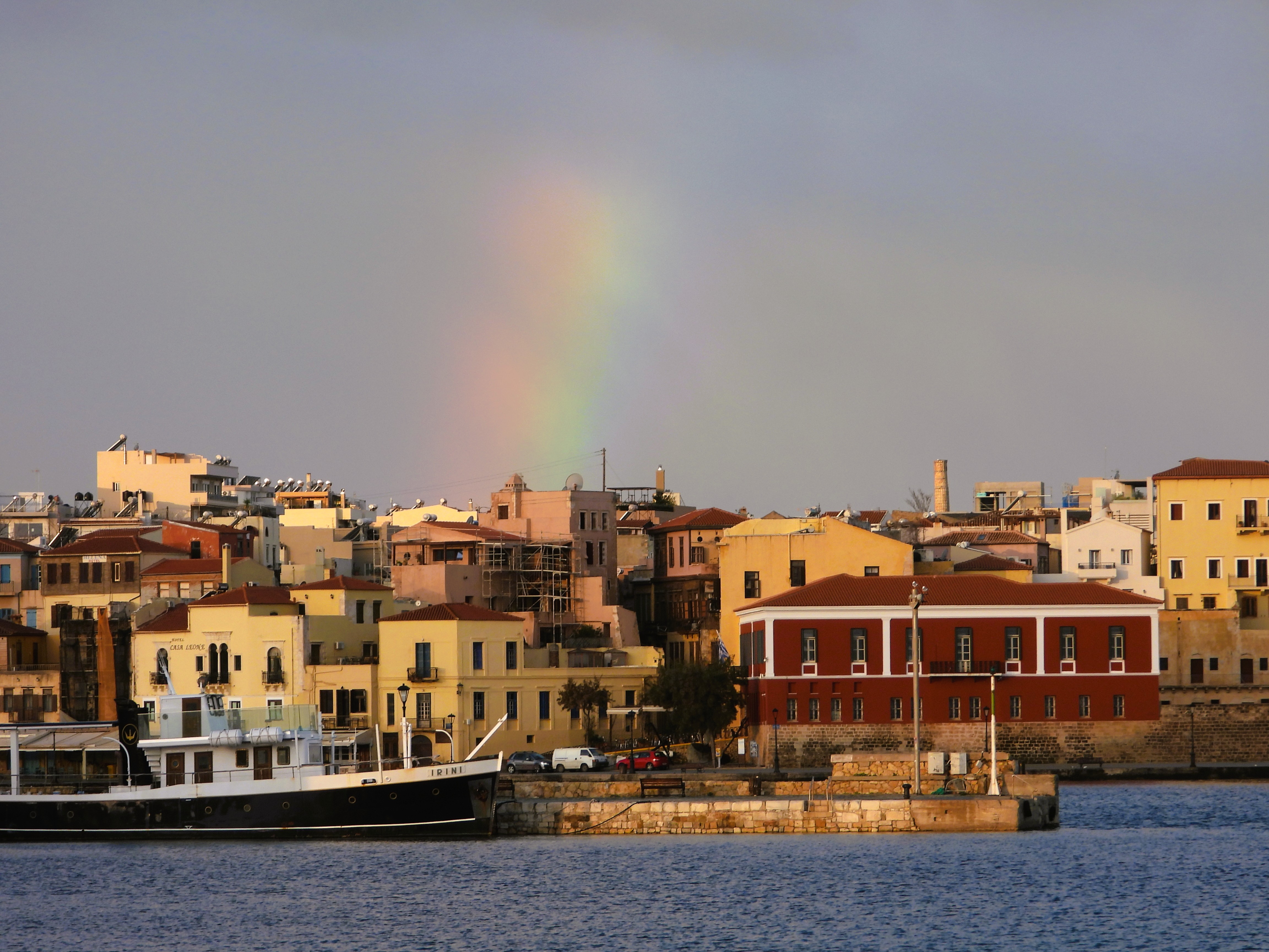 Morgenspaziergang auf der Hafenmauer zum Leuchtturm. Was für ein Schauspiel! Das Meer, der Sonnenaufgang, die uralte Mauer, der Leuchtturm, der 1830er Jahren von Ägyptern auf den Grundmauern eines venezianischen Vorgängers aus dem späten 16. Jahrhundert errichtet worden ist; ein eleganter Seidenreiher und eine Taube begleiteten mich. Und – als sei das nicht genug – stieg auch noch ein Regenbogen aus den Häusern auf!