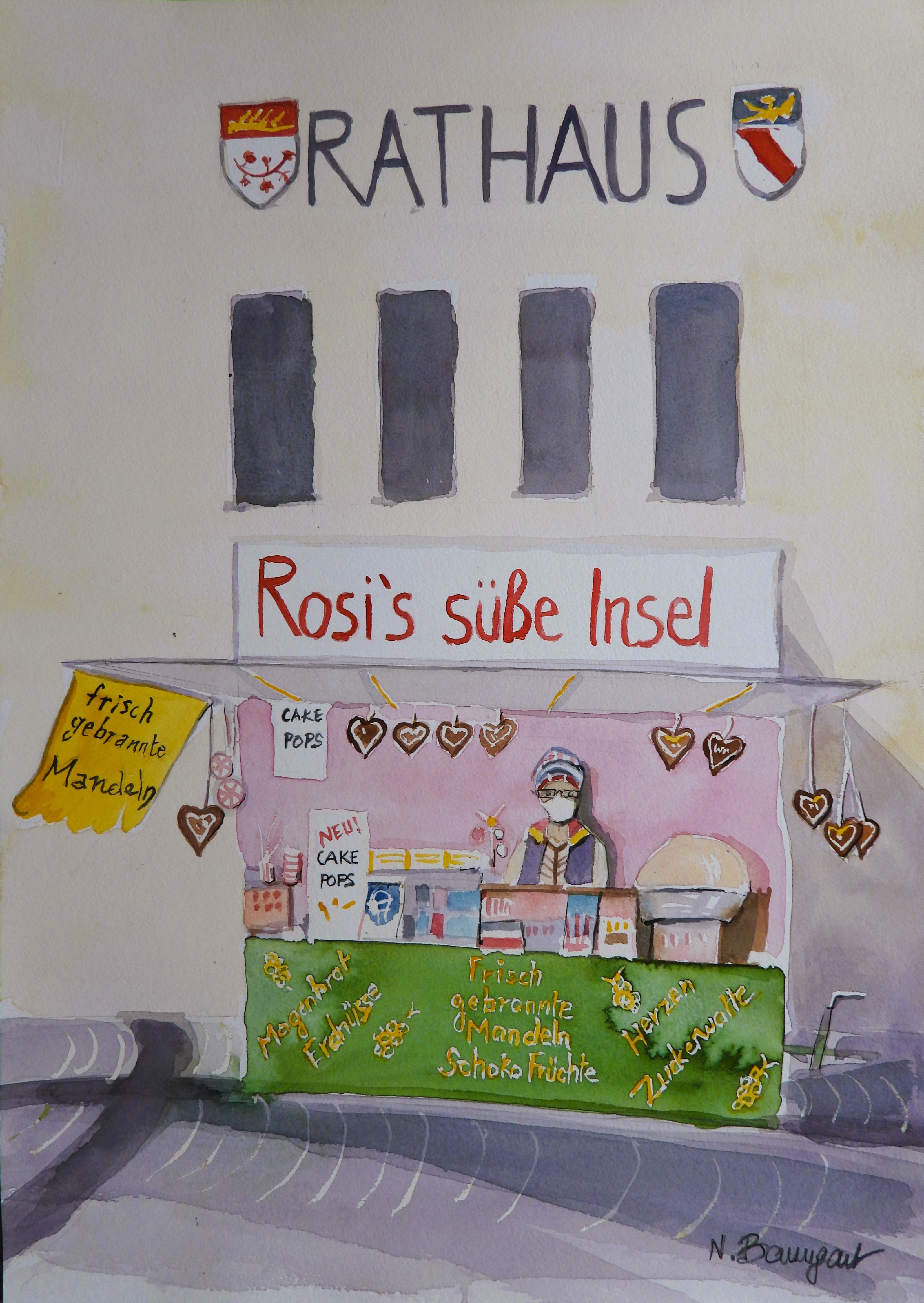 EN: Do you remember the Covid years? Everything felt frozen, as if the world had been put on pause. That’s when I painted this scene: Rosi’s Sweet Island on the Bad Birnbach marketplace — exactly as it looked back then.