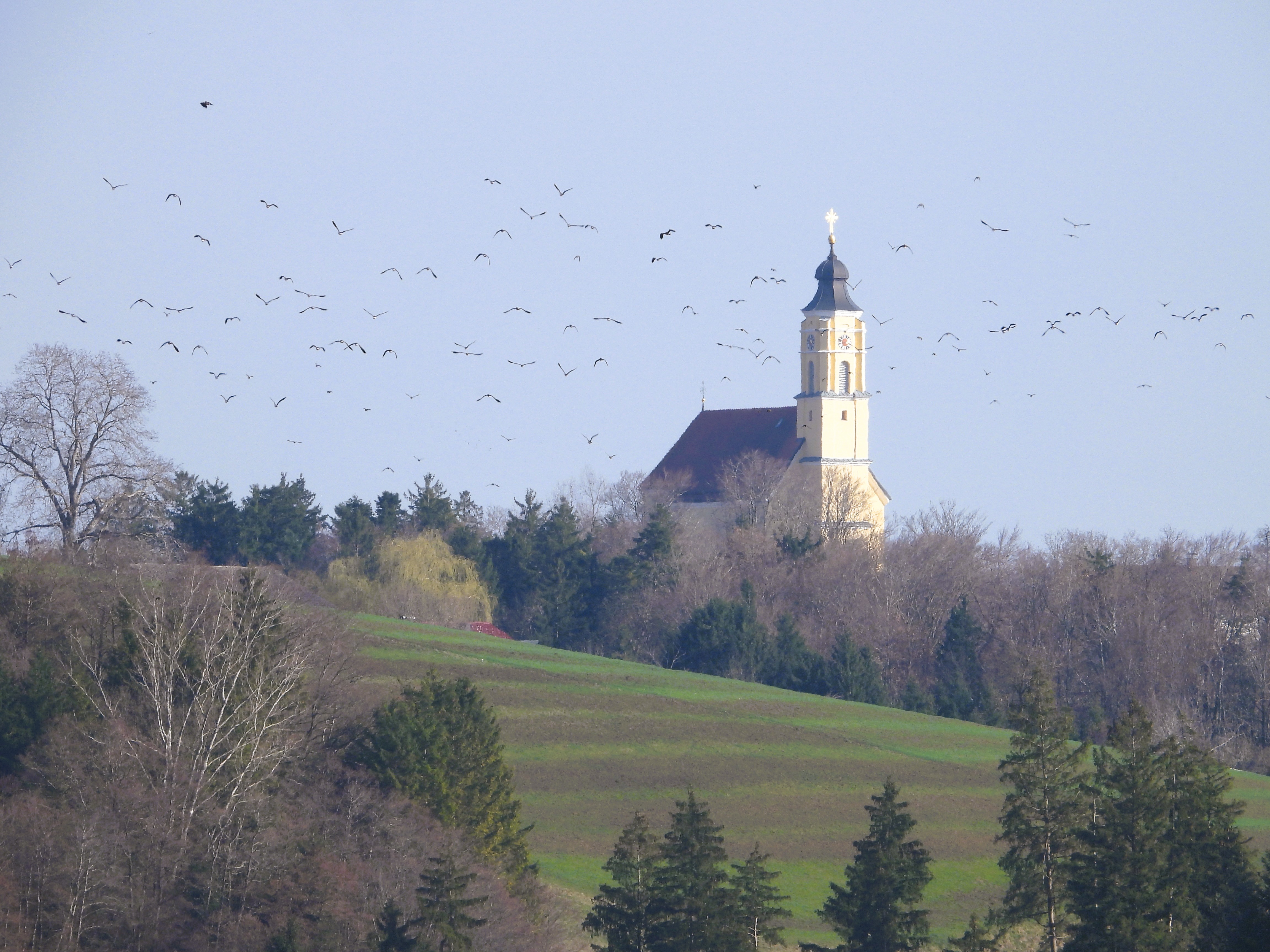 Blick auf eine Kirche auf einem Hügel, umgeben von Bäumen und Feldern, mit vielen Vögeln, die darüber fliegen.