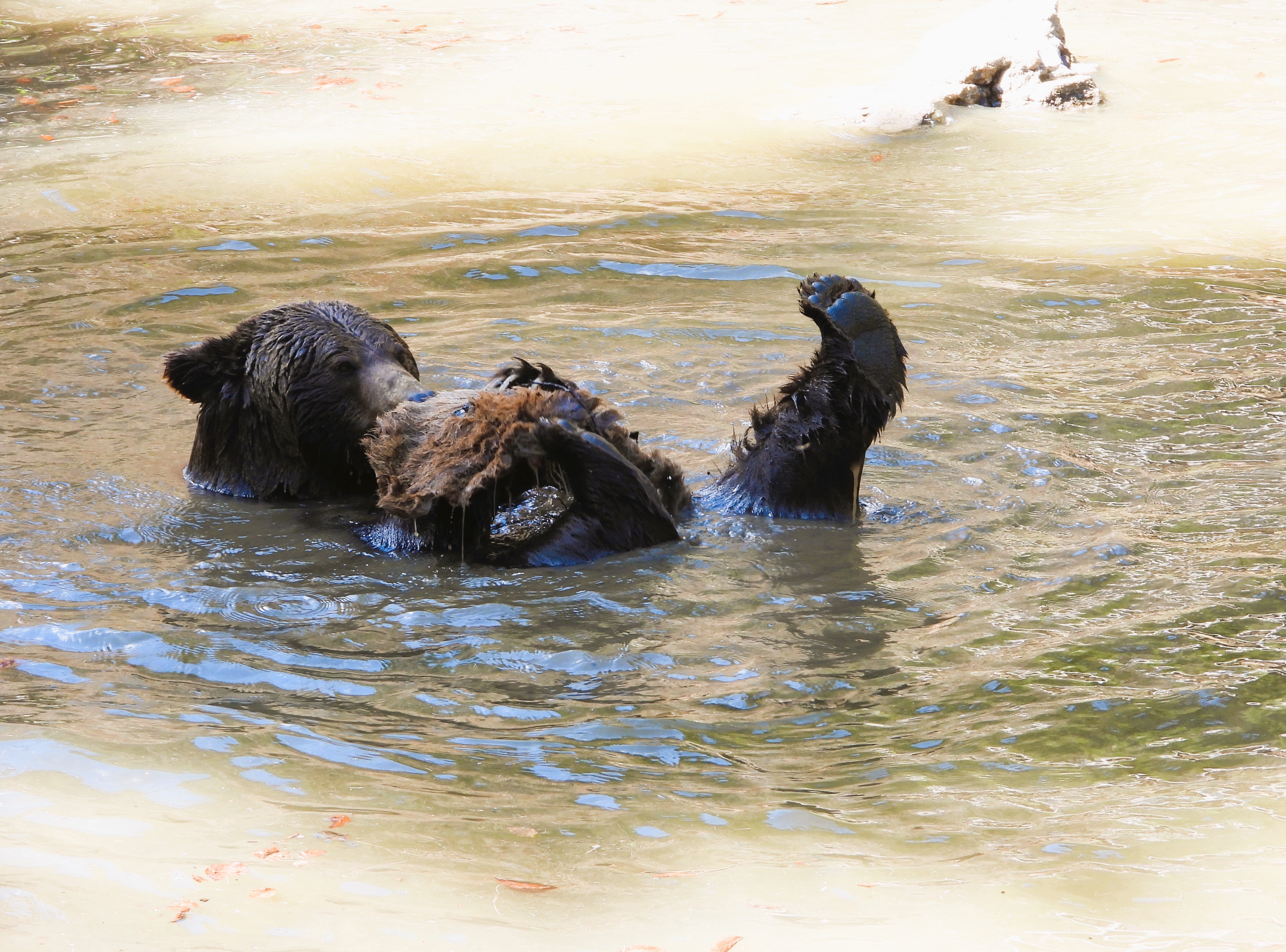 Die beiden Braunbären Luna und Benny waren sehr aktiv. Benny fand ein altes Fell, das er als Spielzeug nutzte und mit einer unglaublichen Energie durch die Gegend schleuderte. Immerhin sind beide – falls ich nicht irre – schon über 20 Jahre alt! Es war eine Wonne, ihm zuzuschauen, insbesondere als er das Fell ins Wasser mitnahm und um sich spritzte. Lebensfreude pur!