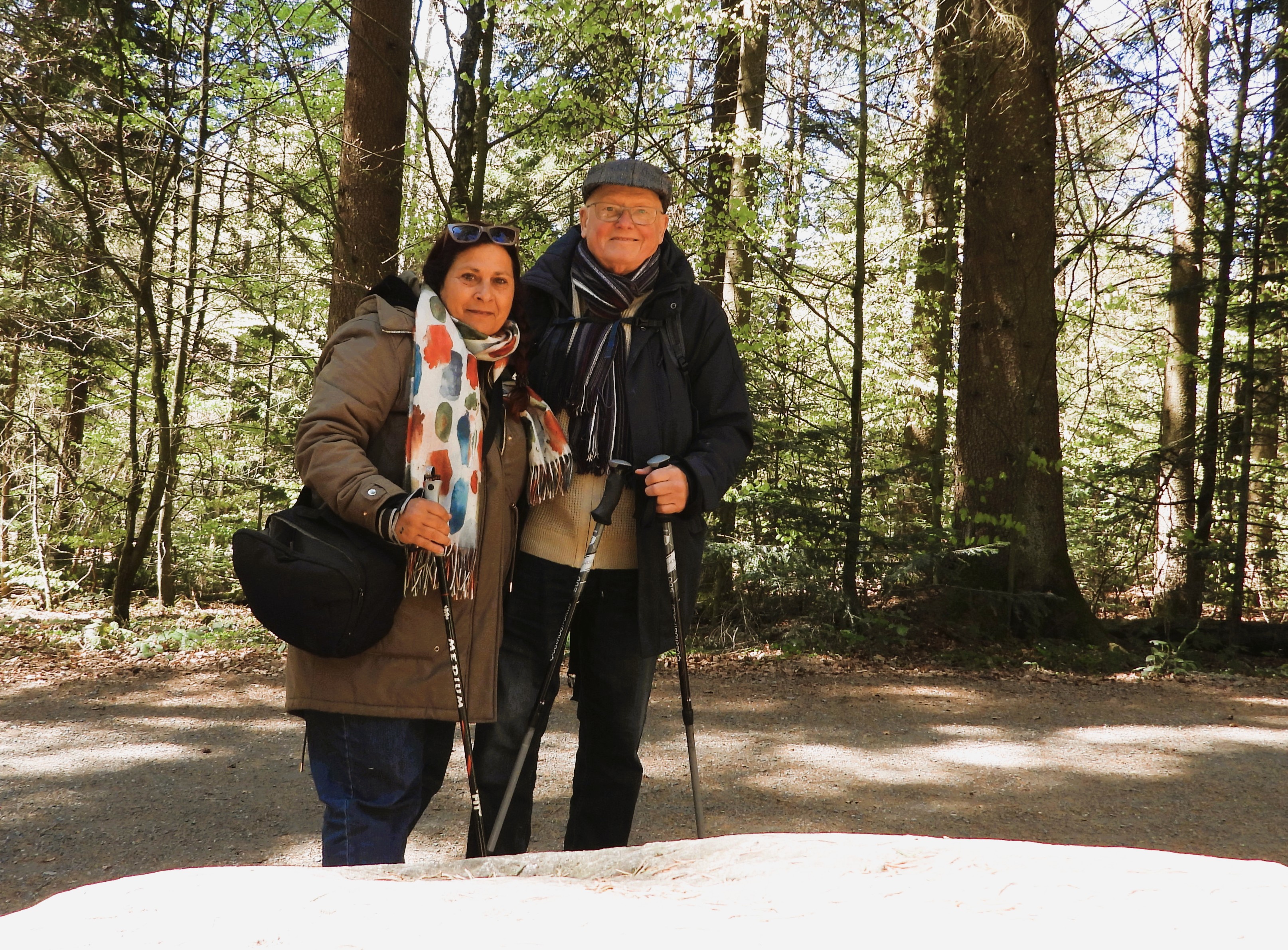 Ein Paar steht in einem Wald, umgeben von Bäumen, während sie Wanderstöcke halten. Die Frau trägt einen langen Mantel und einen bunten Schal, der Mann hat einen Hut und einen Schal an.