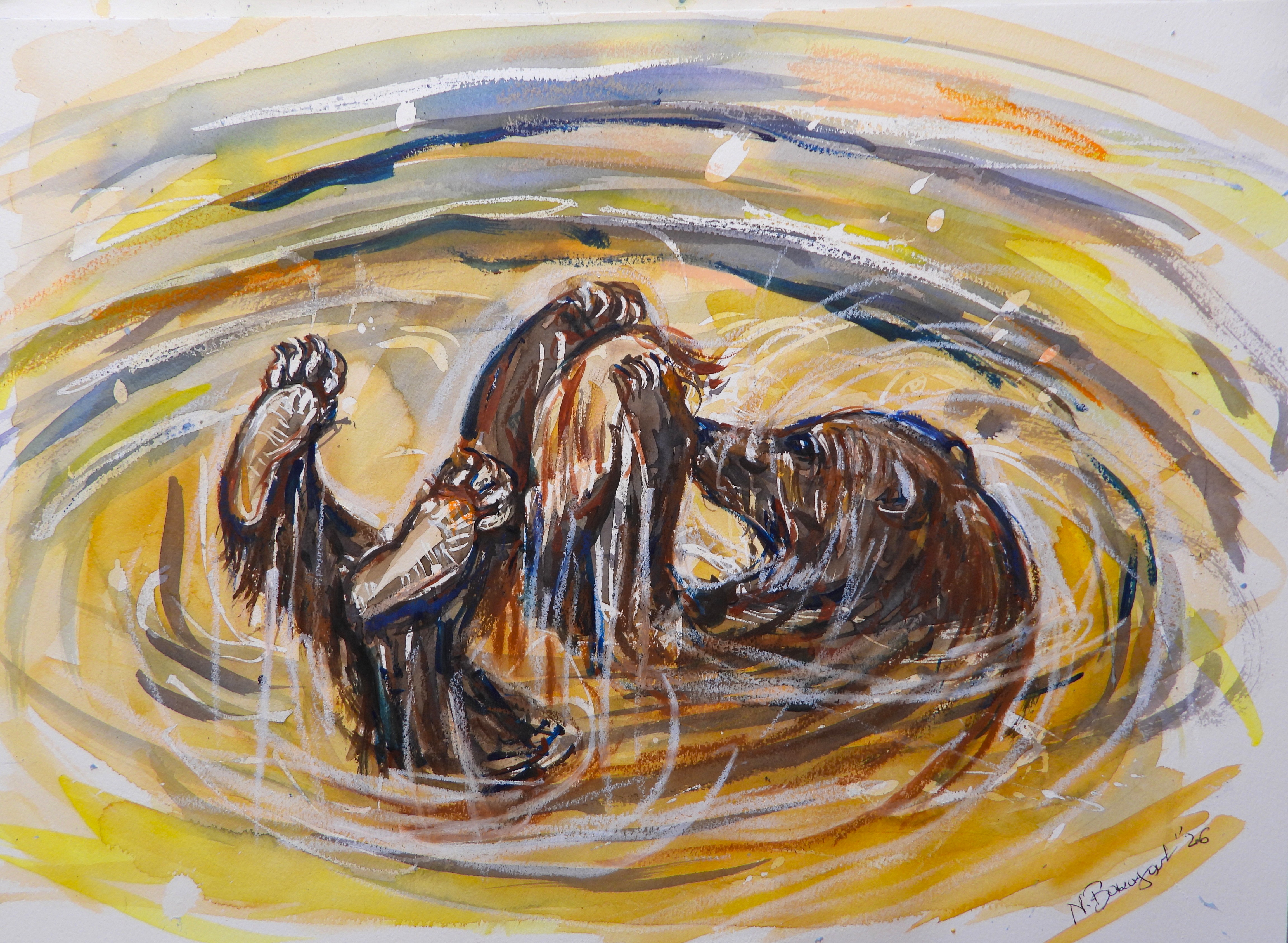 Ein Aquarellbild von zwei Bären, die spielerisch im Wasser ringen. Ihre Füße sind sichtbar, umgeben von dynamischen Wasserwirbeln in Gelb- und Brauntönen.