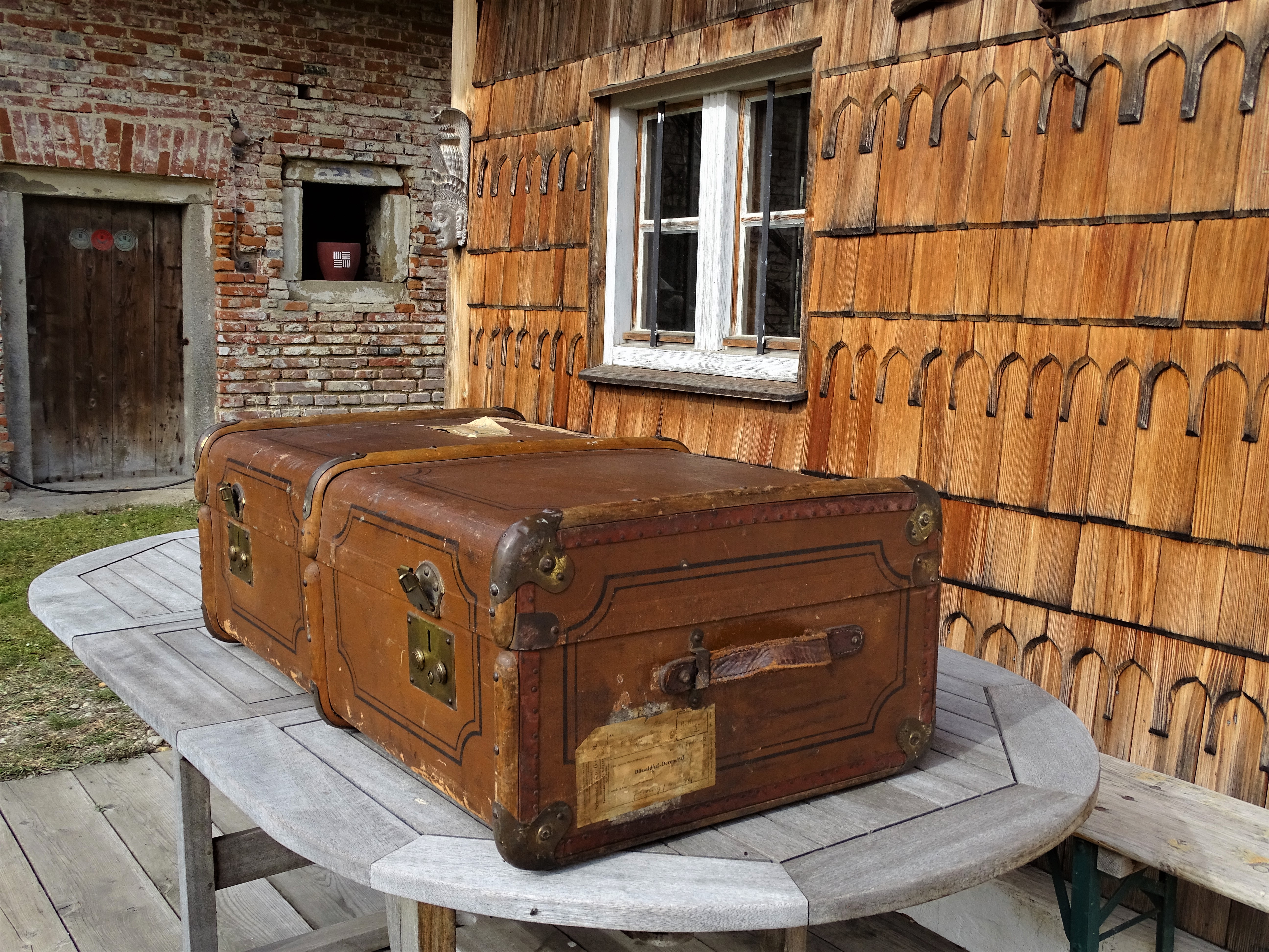 Ein schöner Koffer, dessen Bemalung perfekt mit dem Muster de Holzschindeln an der Hauswand harmoniert. LikeLike Antworten