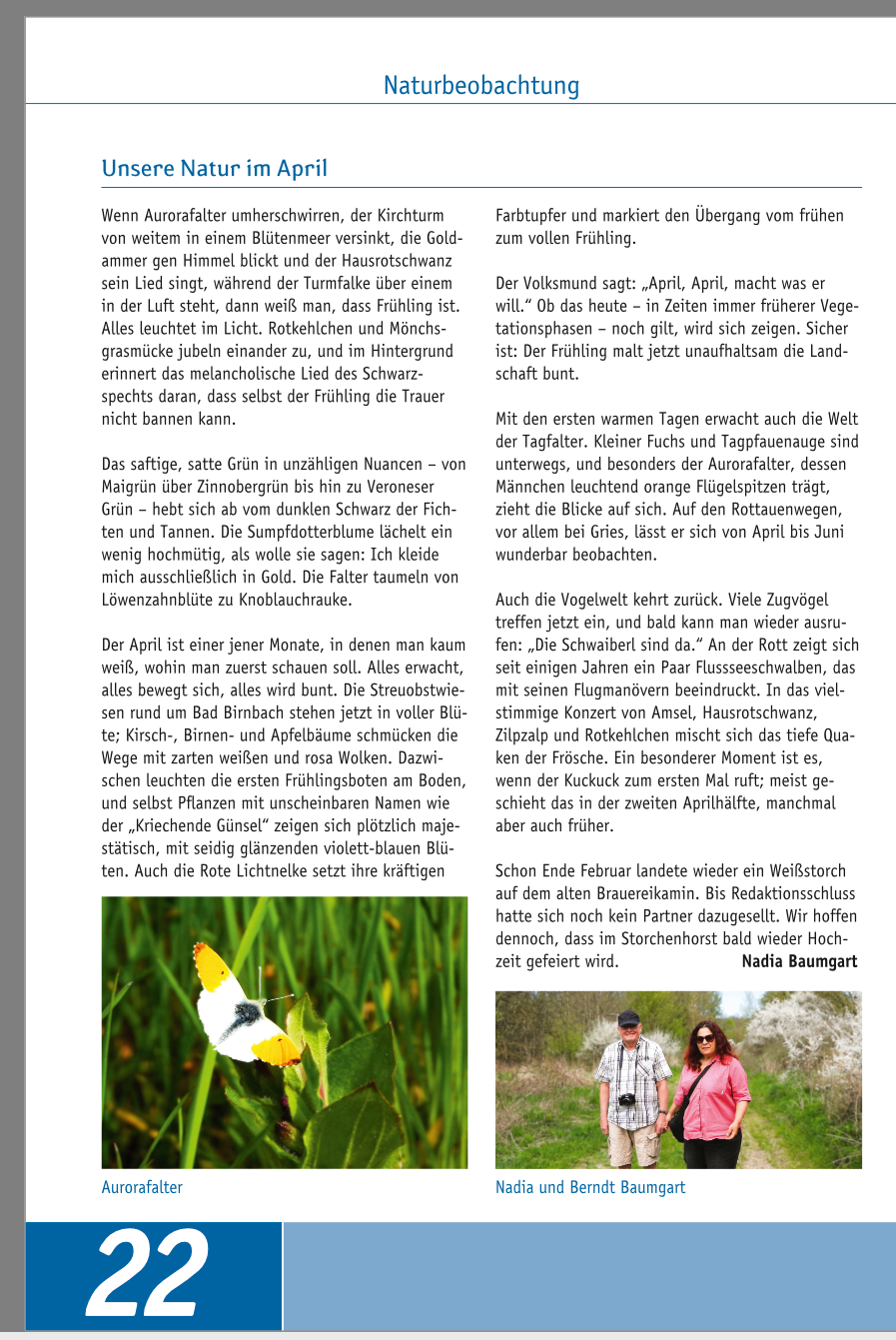 Auch die Vogelwelt kehrt zurück. Viele Zugvögel treffen jetzt ein, und bald kann man wieder ausrufen: „Die Schwaiberl sind da.“ An der Rott zeigt sich seit einigen Jahren ein Paar Flussseeschwalben, das mit seinen Flugmanövern beeindruckt. In das vielstimmige Konzert von Amsel, Hausrotschwanz, Zilpzalp und Rotkehlchen mischt sich das tiefe Quaken der Frösche. Ein besonderer Moment ist es, wenn der Kuckuck zum ersten Mal ruft; meist geschieht das in der zweiten Aprilhälfte, manchmal aber auch früher.