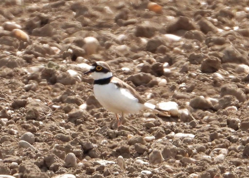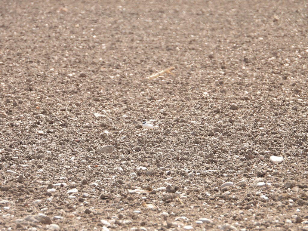 Yeah, unser erster Flussregenpfeifer! Dass wir ihn überhaupt wahrnehmen konnten, lag daran, dass er in unserer Nähe auf dem Acker gelandet ist. Wie klein und gut getarnt er ist, das zeigt Foto Nummer 2. Wahrscheinlich brütet er am Fluss. Sein Nest baut er als Mulde am Boden.