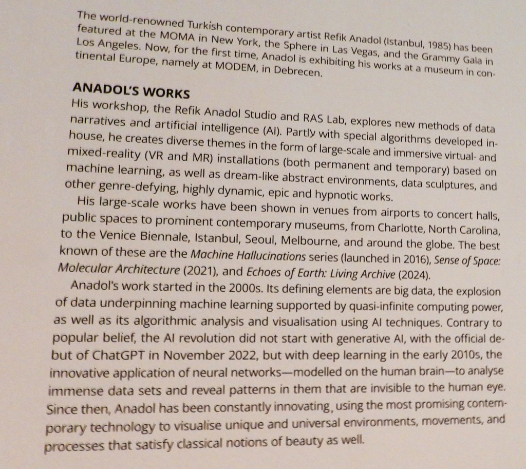 RUMI DREAMS vom türkischen Künstler Refik Anadol. Auf einer riesigen Leinwand zeigt das Mixed-Reality Video im MODEM Museum tanzende Derwische und ihre flatternde weiße Kleidung. Derwische drehen sich ja in Harmonie mit der Natur, mit dem Ziel, sich mit den kleinsten Zellen zu verbinden und sich mit den Sternen am Himmel zu drehen. Das Geniale an dieser Installation ist, dass sich die Derwische tatsächlich langsam in Zellen, in organische Formen, in bunte Partikel auflösen, die dann in großen Wellen alle Moleküle des Alls zusammenwerfen und ineinanderfließen lassen.