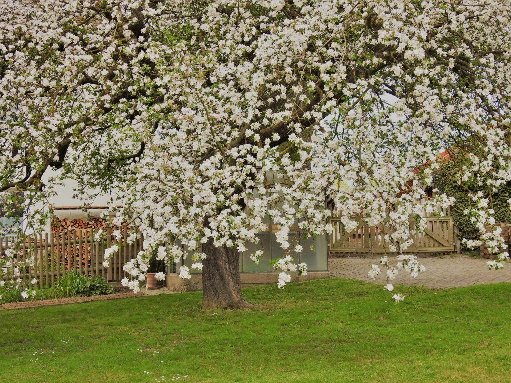 Ich gehöre nicht zu denjenigen, die Bäume umarmen. Aber dieser 60-jährige Apfelbaum in unserer Nachbarschaft, der nur alle zwei Jahre so aufblüht, erzeugt in mir doch starke Gefühle. Er ist nicht nur wunderschön; wenn man unter ihm steht, fühlt man sich eingehüllt und geborgen. Er wirkt wie ein alter, weiser Freund und schenkt seinem Besitzer auch noch Zentner von aromatischen Boskoop-Äpfeln.