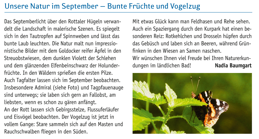 In den Rottaler Wäldern locken lange Spaziergänge durch farbenfrohe Wälder. Mit etwas Glück kann man Feldhasen und Rehe sehen, die im September aktiver werden. Auch ein Spaziergang durch den Kurpark hat jetzt einen besonderen Reiz: Rotkehlchen und Drosseln hüpfen durch das Gebüsch und laben sich an bunten Beeren, während Grünfinken in den Wiesen an den Samen naschen.