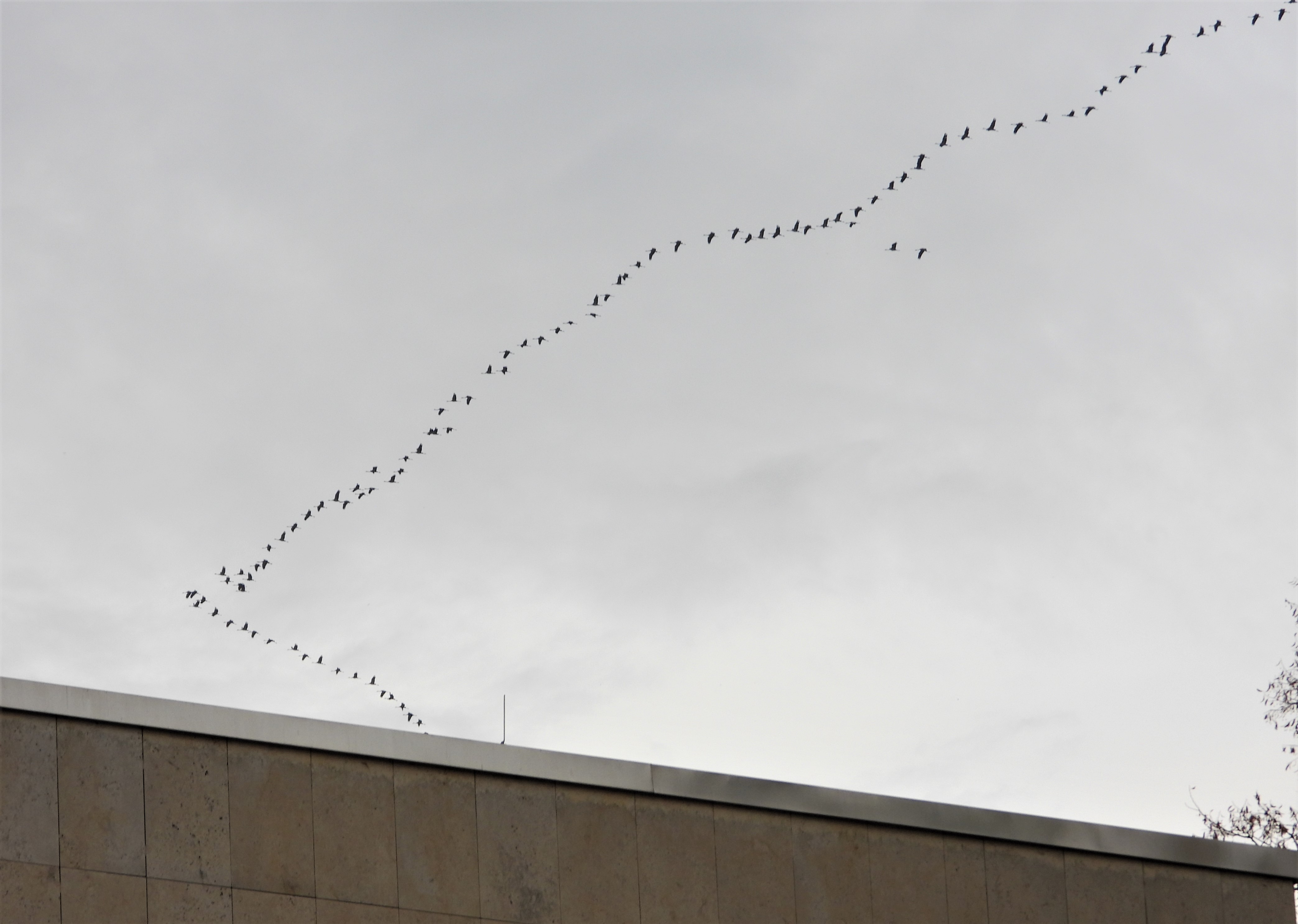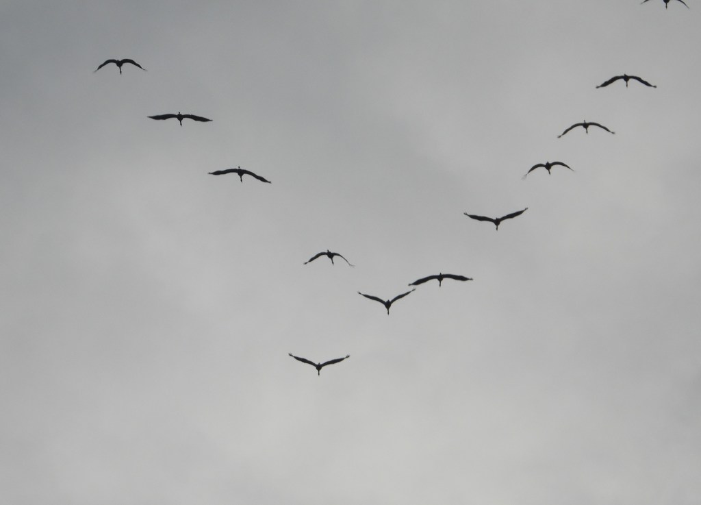 Im ersten Zug waren etwa 300 Vögel, danach kam noch ein Trupp von ca 500 Kranichen. Es ist faszinierend, die riesigen V-förmigen Formationen beim Flug zu beobachten. Die Vögel trompeten laut, um in Kontakt zu bleiben.