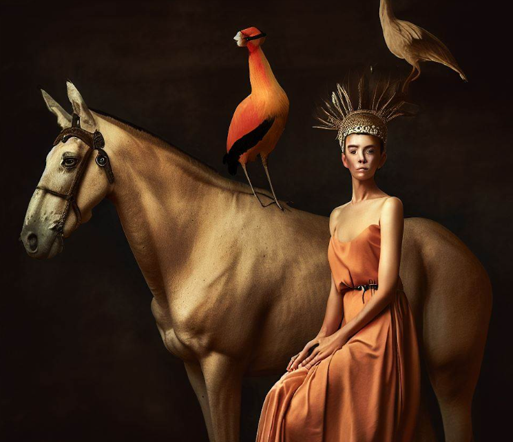 „Eine Frau im orangenen Kleid sitzt auf einem hellbraunen Criollo-Pferd, ein Königskranich sitzt auf der Kruppe des Pferdes hinter ihr, ein anderer Königskranich steht vor dem Pferd. Der Hintergrund ist eher dunkel.“