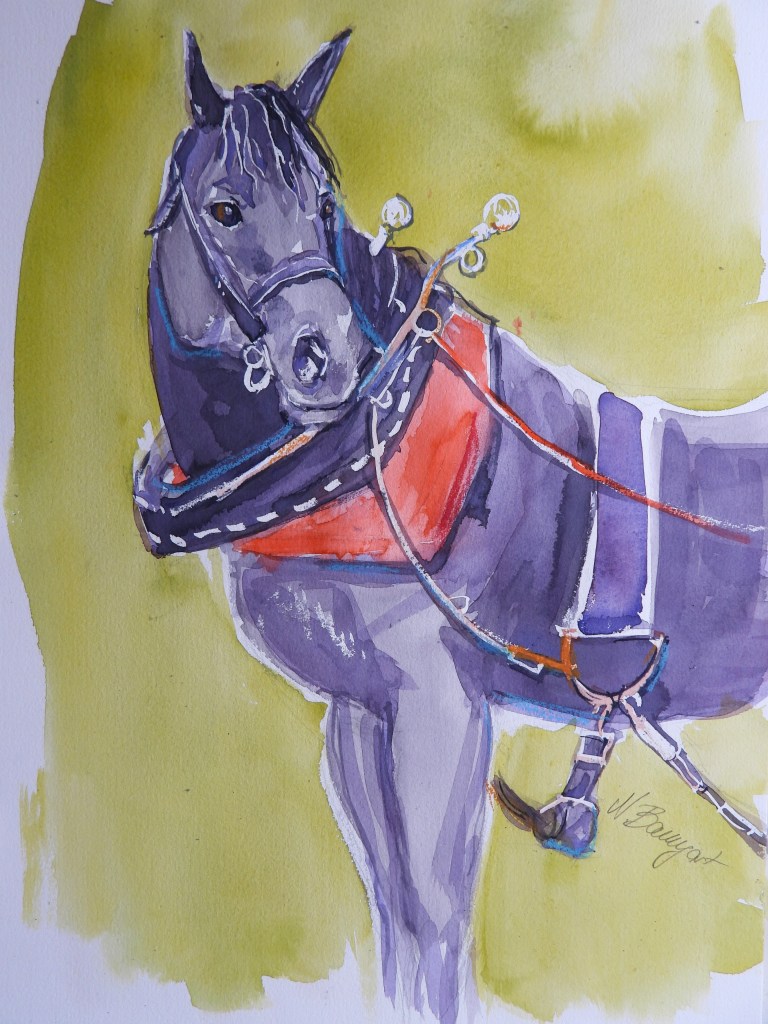 Ich habe ein Aquarell einer Reiterin mit Königskranichen gemalt, weil ich vorgestern mit diesem Bild im Kopf aufwachte.