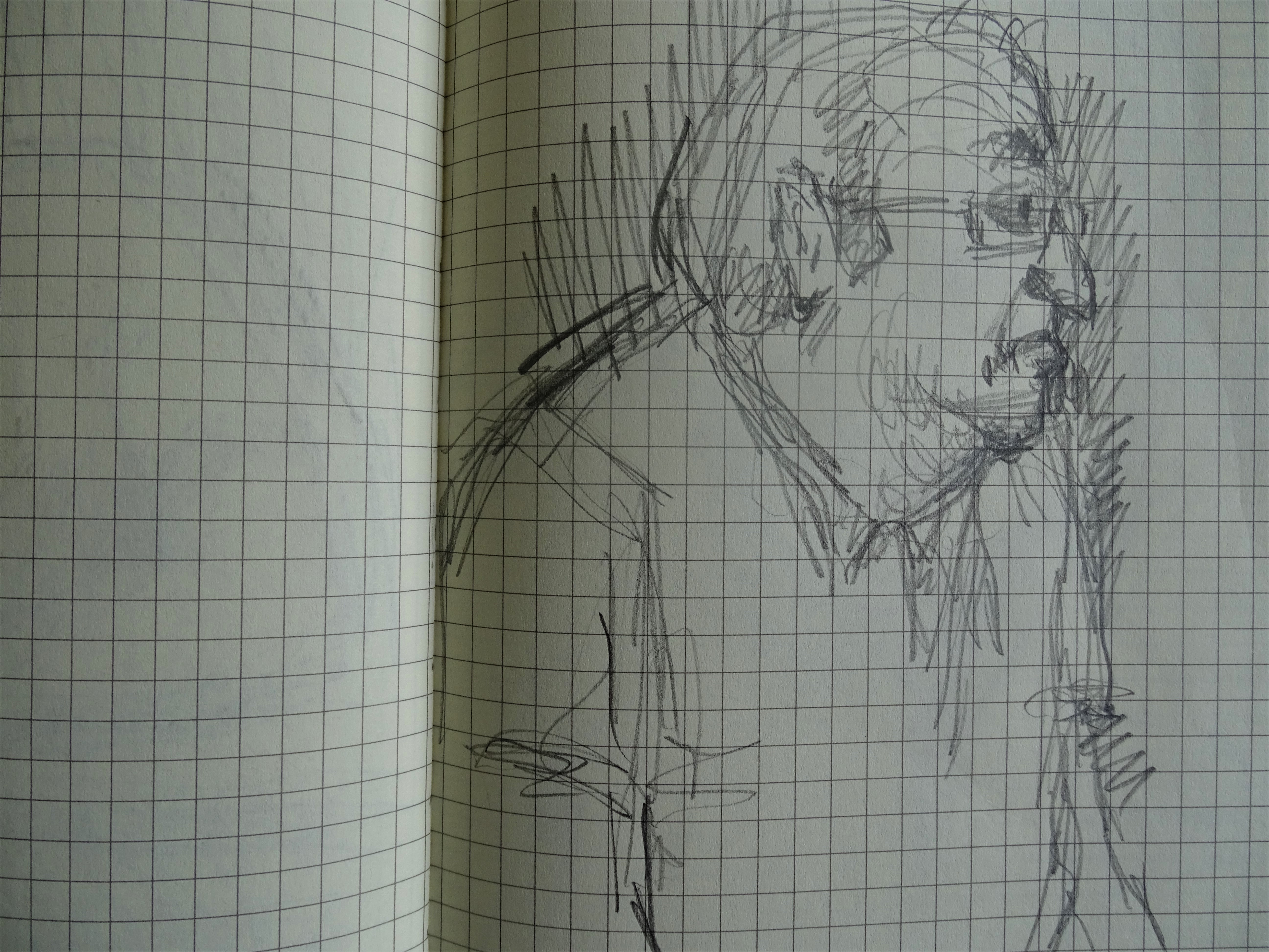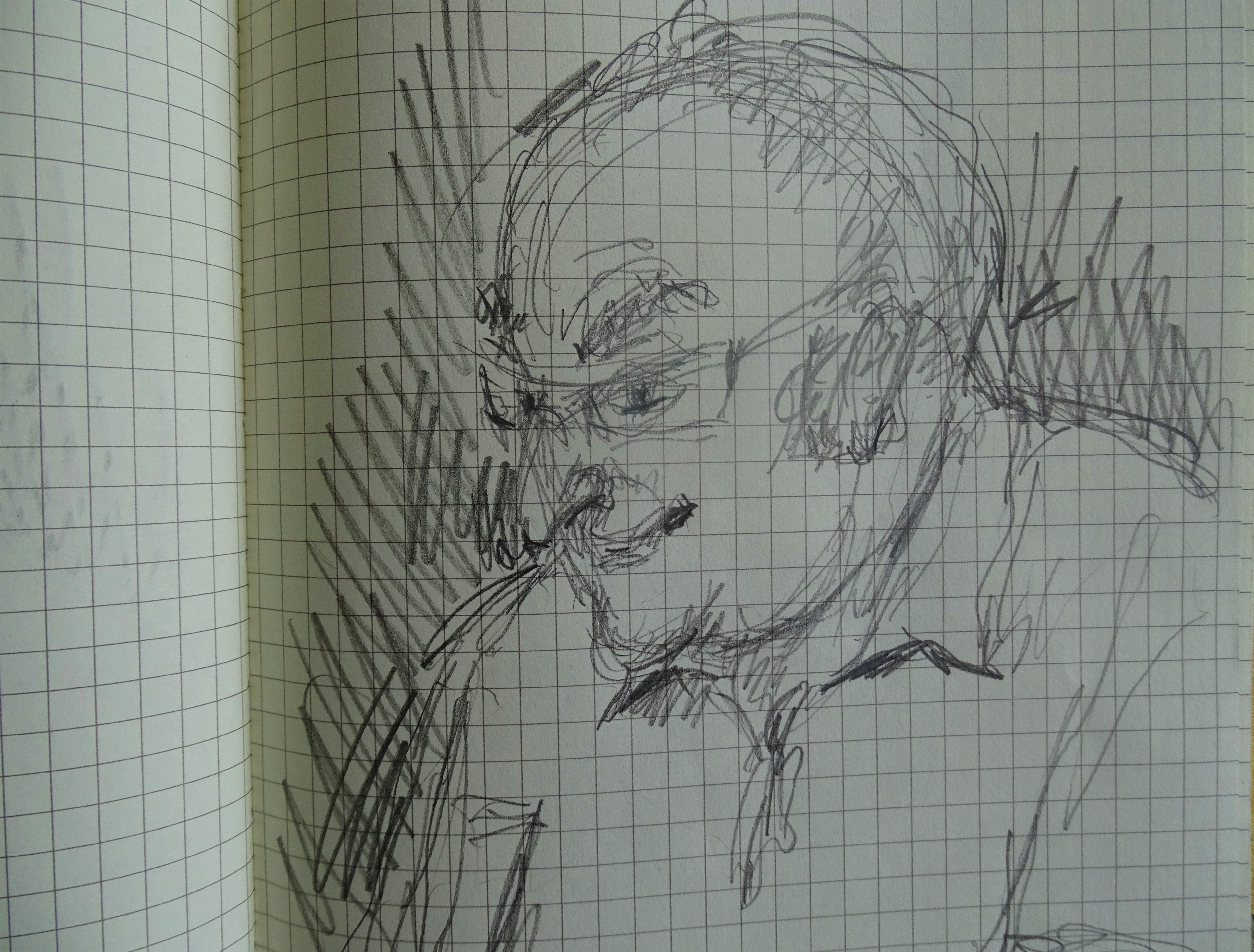 Bitterböse wie immer: der Kabarettist Sigi Zimmerschied bei seinem neuen Stück „Heil – vom Koma zum Amok“ gestern Abend im Scharfrichterhaus in Passau. Ich habe mitgekritzelt und versucht, seine ständig wechselnden Ausdrücke aufs Papier zu bannen…Was gar nicht so einfach war. Denn die Mimik des Kabarettisten ändert sich buchstäblich jede Sekunde! http://sigi-zimmerschied.de/heil-vom-koma-zum-amok/
