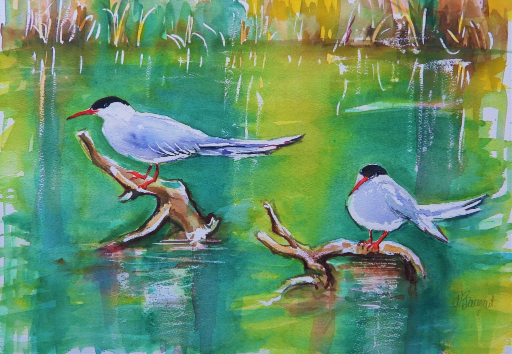„Das sind Flussseeschwalben,“, sage ich belustigt, „die sind bei uns ganz selten und gefährdet!“. Ich sprach noch davon, dass es etwas ganz Besonderes sei, solch ein Paar in der Brutzeit in der freien Natur anzutreffen, da die meisten Vögel dieser Art die wir in Bayern antreffen können, inzwischen auf „Brut-Flößen“ brüten, die von Menschen gebaut werden. Die Leute gingen recht unbeeindruckt weiter.