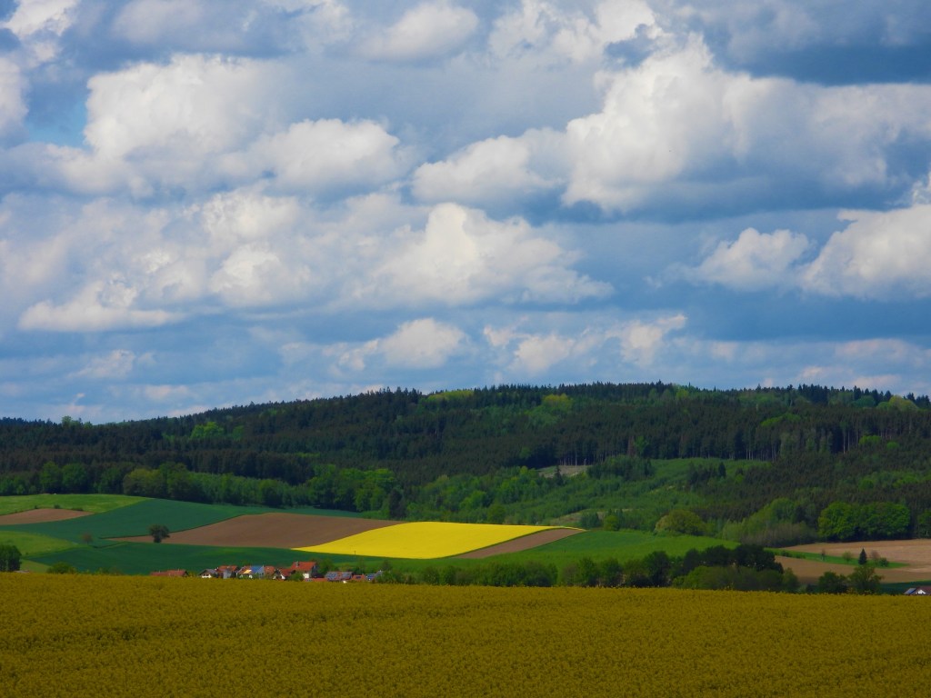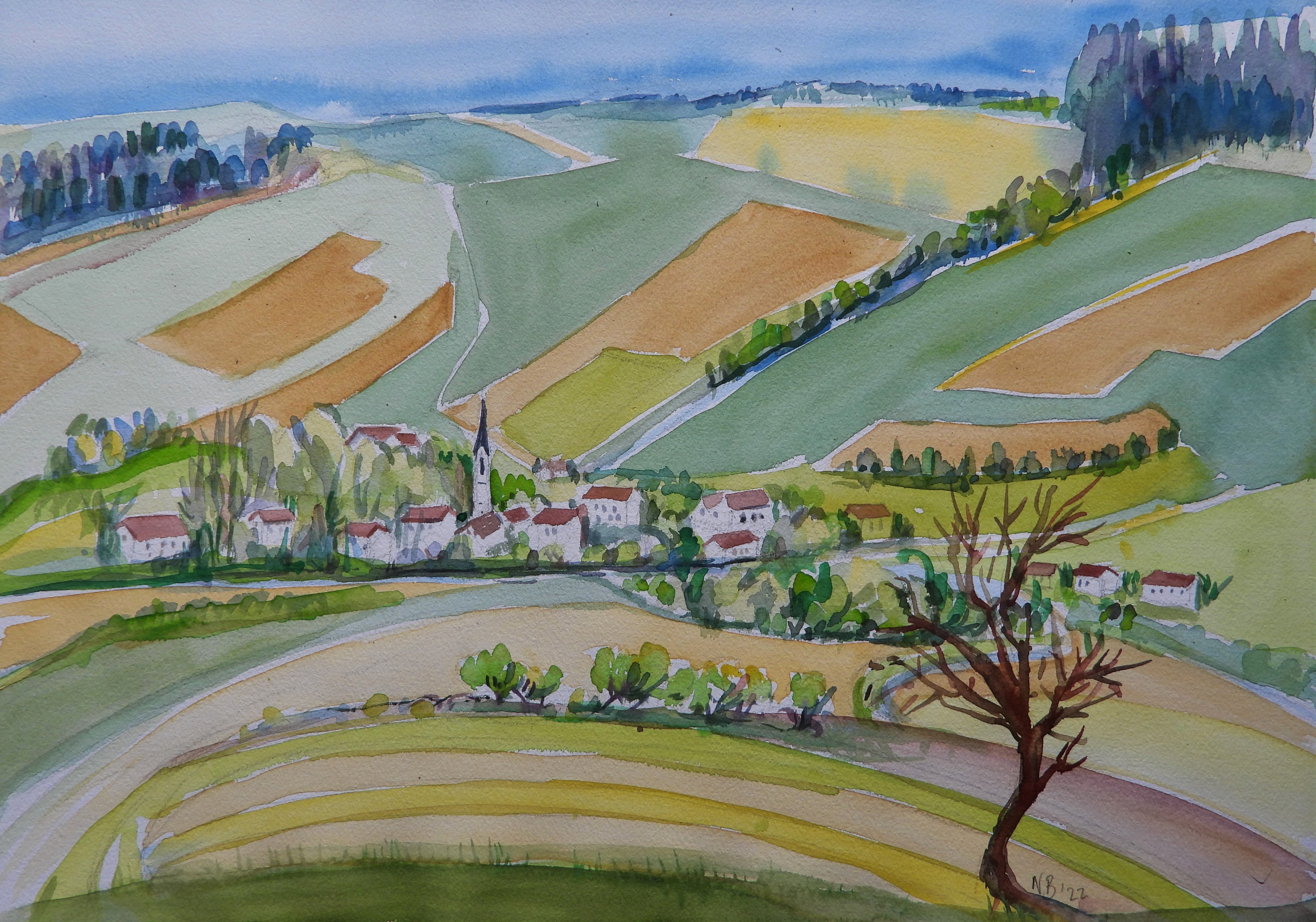 Noch ist es Februar, aber schon spürt man, dass der Frühling naht…Die Vögel markieren schon singend und zwitschernd ihre Reviere, das Licht lässt auch blasse Farben aufleuchten. Da kommt Freude auf. Gestern war ich in Buchet im Rottal. Die Landschaft hat mich zu diesem Bild inspiriert: farbenfroh und geometrisch. So sieht es nämlich aus – unser Wellenland in Niederbayern.