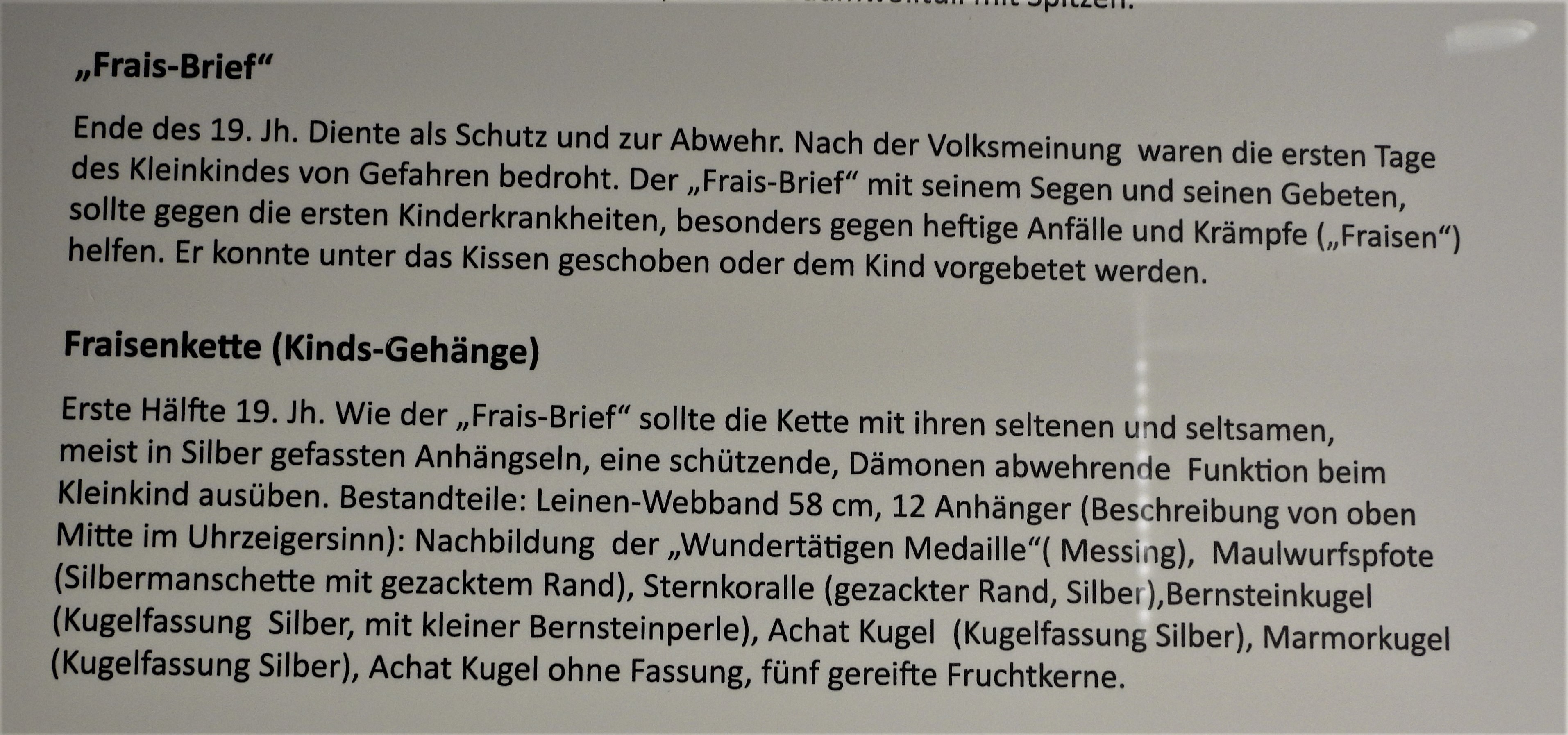 Als Schutz und zur Abwehr trugen Kinder im 19. Jahrhundert sogenannte „Fraisenketten“ und die Eltern verlasen über ihnen den Frais-Brief, ein Dokument, das sowohl die Krankheit, als auch Dämonen und alles Negative abwehren sollten.