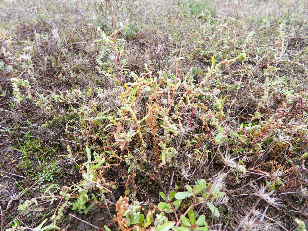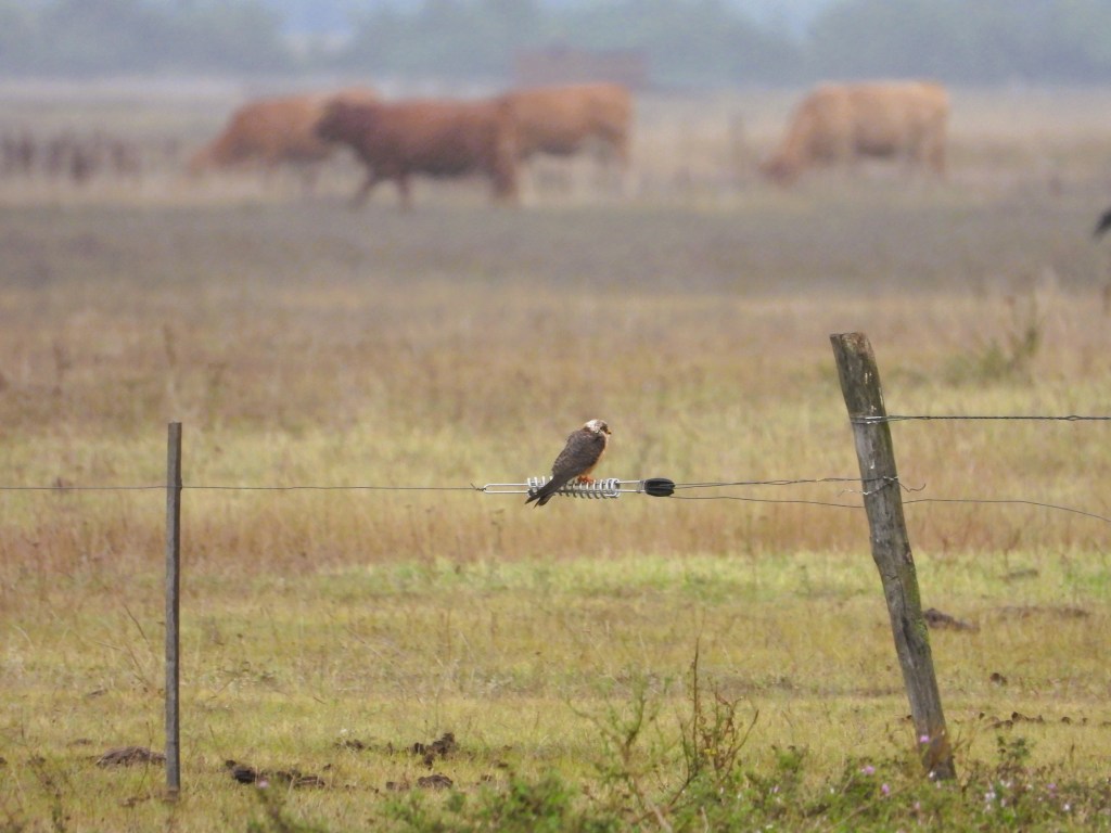 Und dann die Dimensionen: Weit, weit, unendlich streift das Auge am Horizont und doch ist das, was zählt, in den Details: Auf den kargen und salzigen Bodenflächen wachsen wirre Gräser, Ampfer, Strand-Beifuß (Artemisia maritima), Federgras und plötzlich leuchtet einem darin ein intensiv blaues Blümchen aus der Art der Rittersporne entgegen. Zaunpfähle, auf denen Rotfußfalken sitzen. Soo viele Rotfußfalken! Sie sitzen nicht nur auf den Pfählen, sondern rasen durch den Himmel, von Krähen gejagt. Ach ja, die Krähen! Davon gibt es wirklich viele, ihr Gekrächze erfüllt immer wieder die Luft. Es sind Saatkrähen. Hier und da ein einzelner Strauch, kleine Robinienwälder.