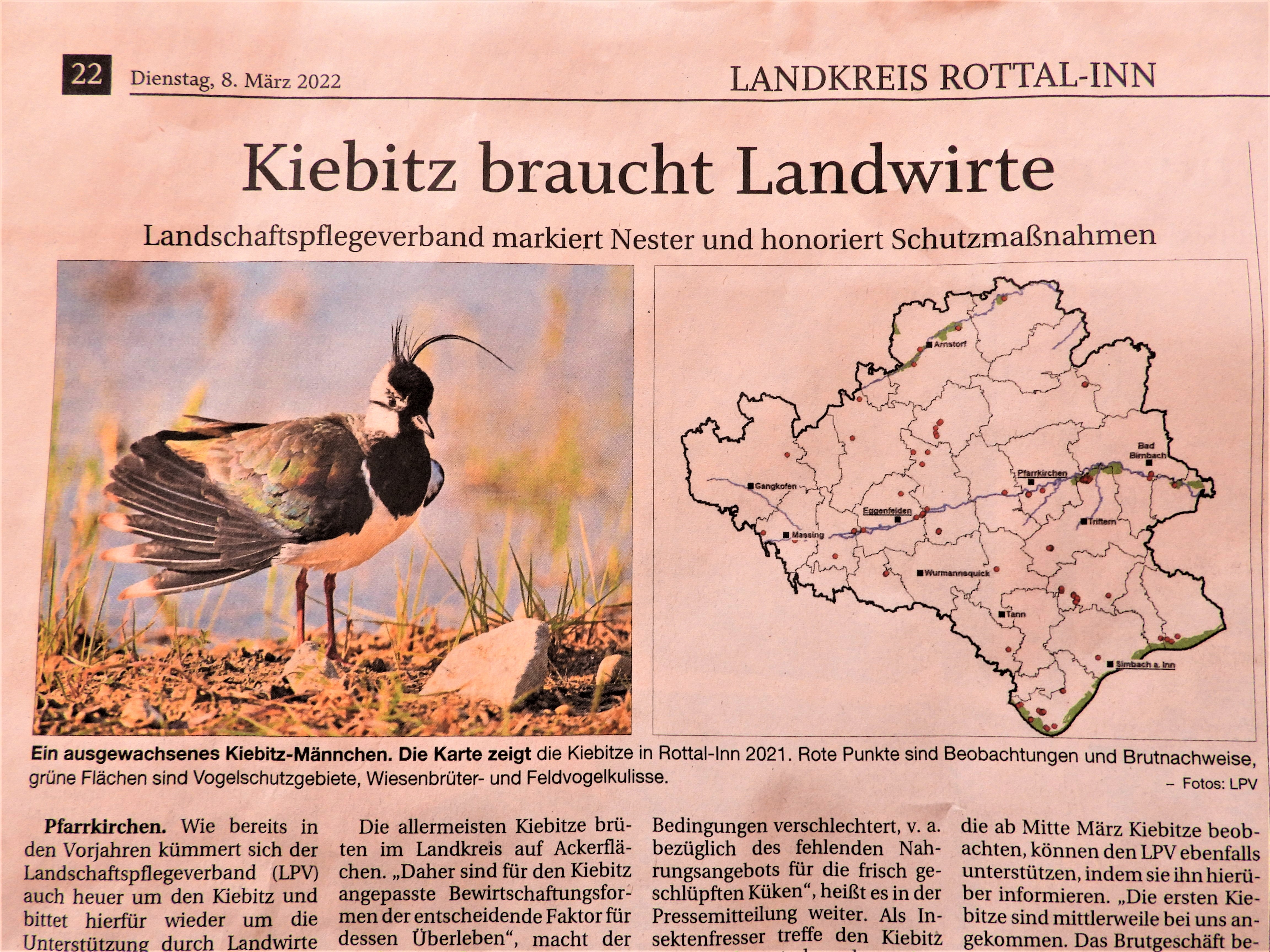 Der Kiebitz ist deutschlandweit, aber auch in Bayern stark gefährdet: Als Bodenbrüter hat er ein sehr gefährliches Leben: Landmaschinen, versiegelte Flächen, aber auch freilaufende Hunde sind seine Feinde. Im letzten Jahr wurden nur 24 geschlüpfte Kiebitzküken in unserem großen Landkreis gesichtet. Wenn das so weiter geht, wird er in unserer Region aussterben.