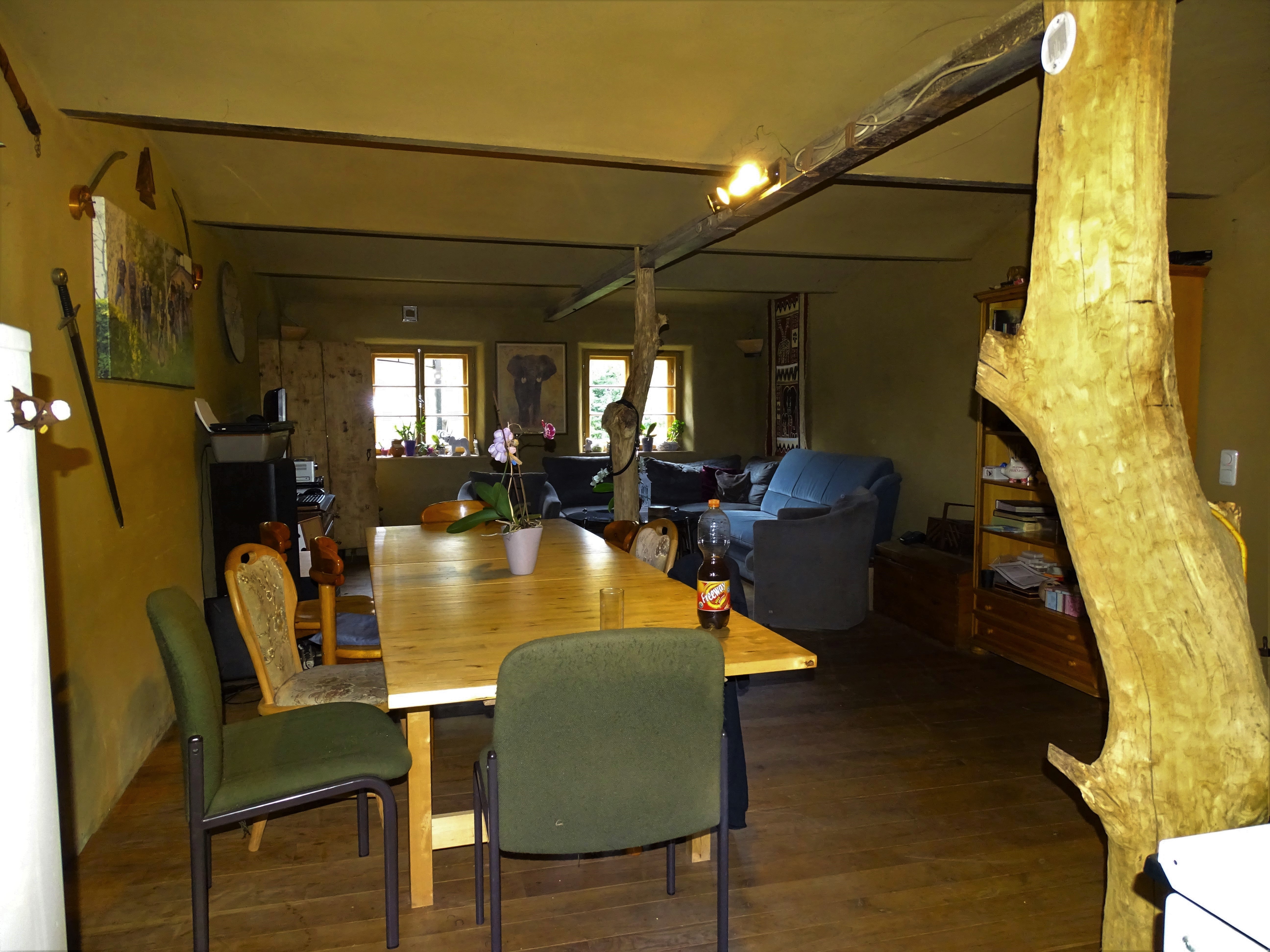„Wir sind ein soziales Projekt“, sagt Udo und zeigt mir den Gemeinschaftsraum, der im ehemaligen Stall entstanden ist. Die lehmverputzten Decken und Wände sorgen für ein angenehmes Raumklima. Eichenstämme gliedern den Raum und zaubern eine gemütliche Atmosphäre. Im oberen Stock soll ein Balken aus dem ehemaligen Birnbacher Schloss eingebaut worden sein.